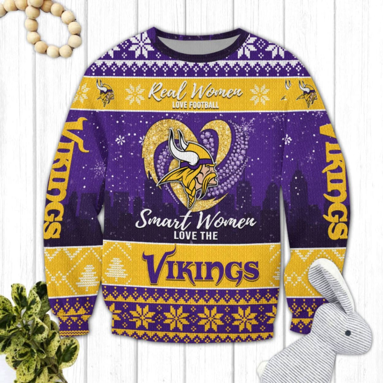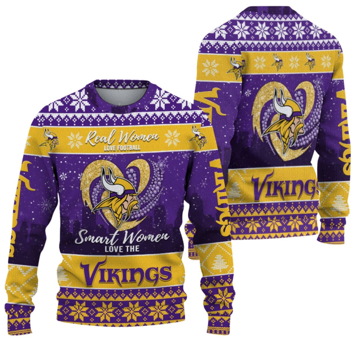 Skol! Get ready to raid the holiday party circuit with undeniable team spirit in the “Real Women Love Football Smart Women Love The Vikings Ugly Christmas Sweater.” This vibrant pullover is drenched in the iconic Vikings purple and gold, blending festive winter motifs with fierce football pride. The spirited statement, “Real Women Love Football Smart Women Love The Vikings,” is proudly displayed, crowned by a glittering, heart-shaped Vikings logo featuring the classic horned helmet.