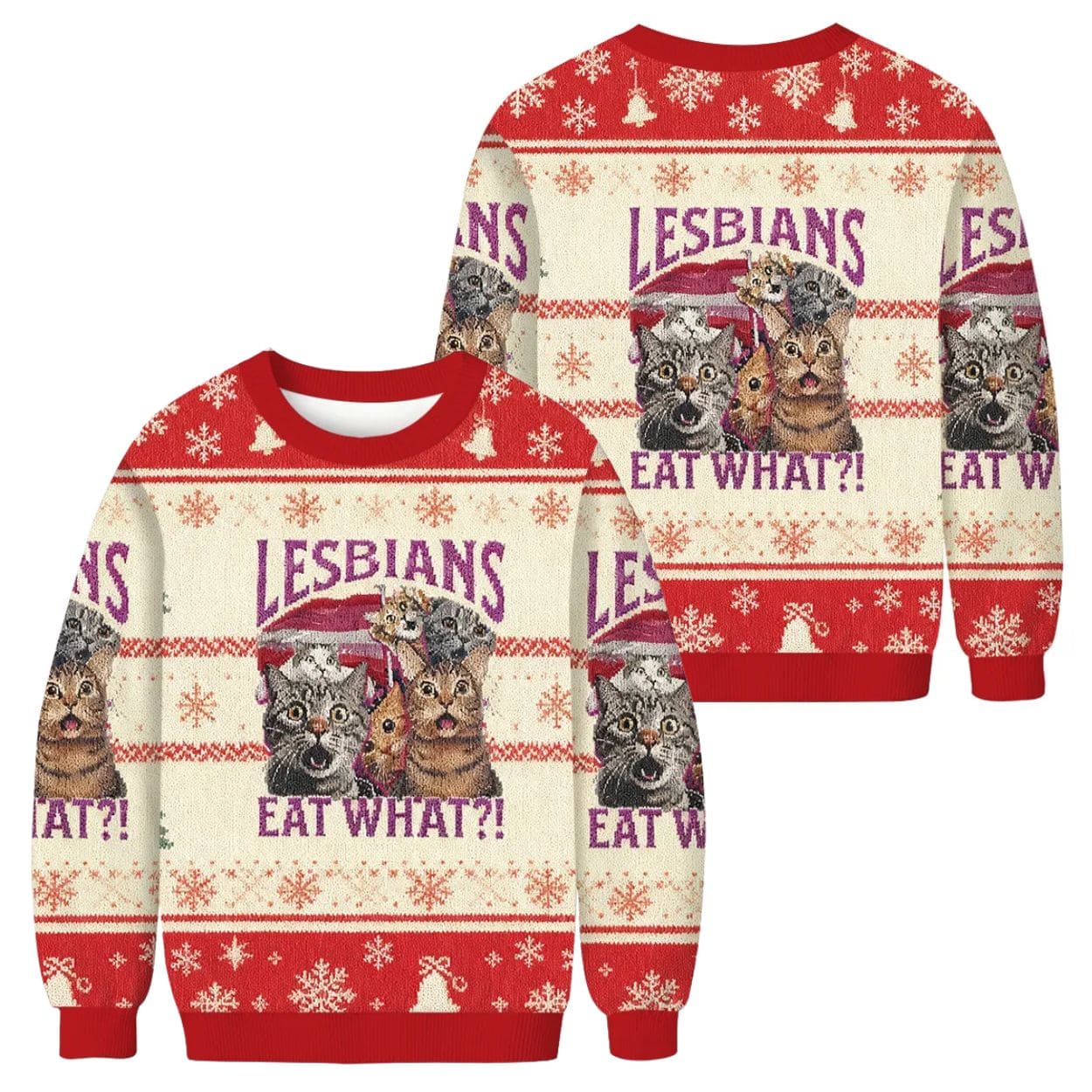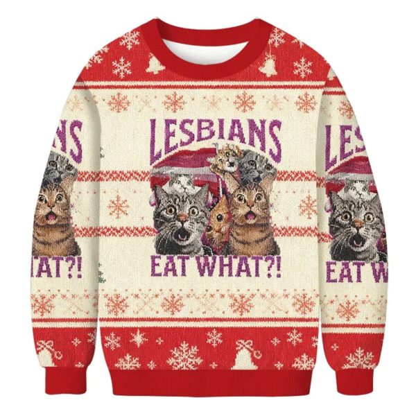 This unforgettable sweater takes the classic ugly Christmas knit and infuses it with internet humor and pride. It features a festive red and cream color scheme with traditional accents like snowflakes and tiny bells. The central focus is the viral graphic of multiple shocked and wide-eyed cats clustered together, looking utterly bewildered. The bold text above and below the felines delivers the punchline: “LESBIANS EAT WHAT?!” Available in an inclusive size range from S to 6XL, this piece is ready for every boldly humorous individual.