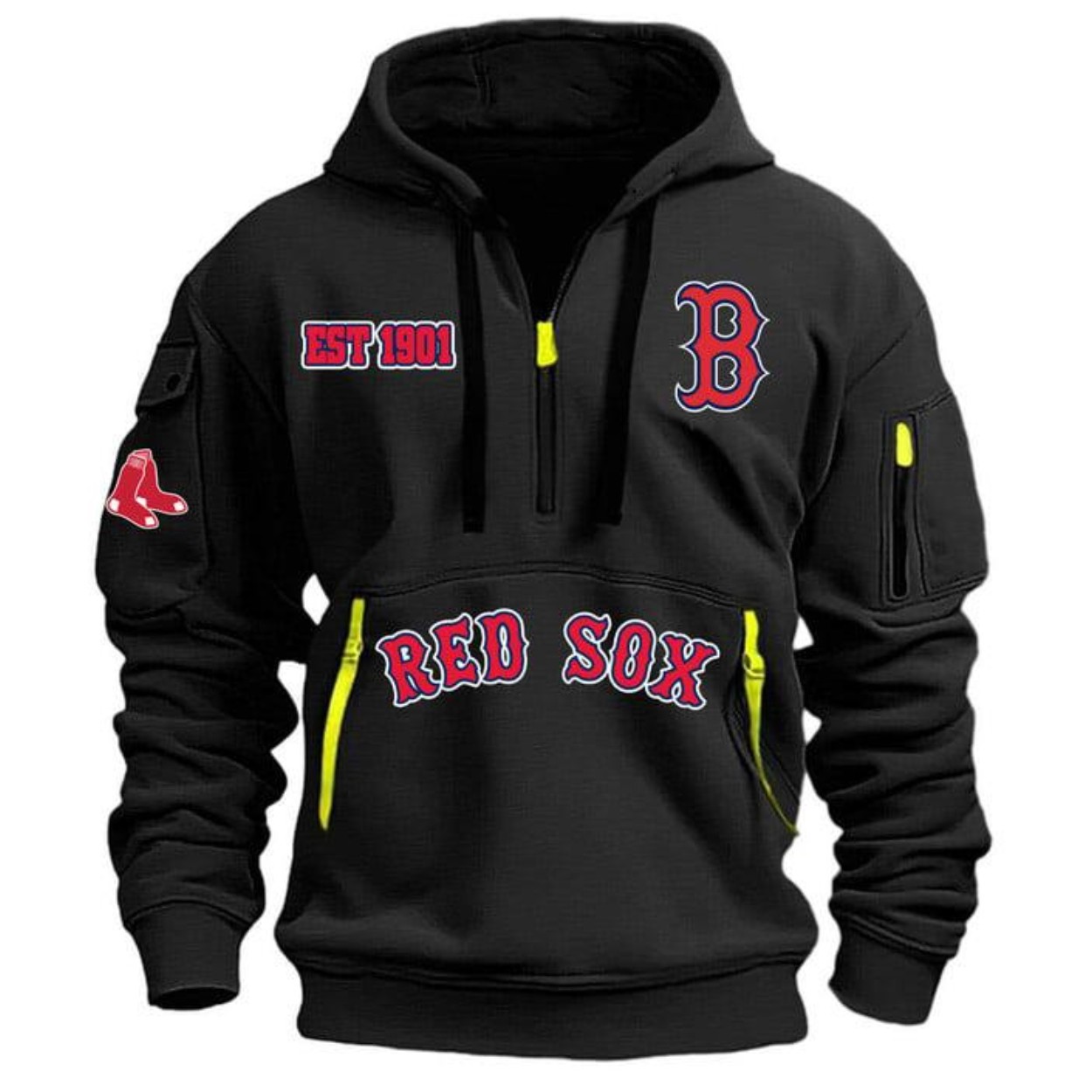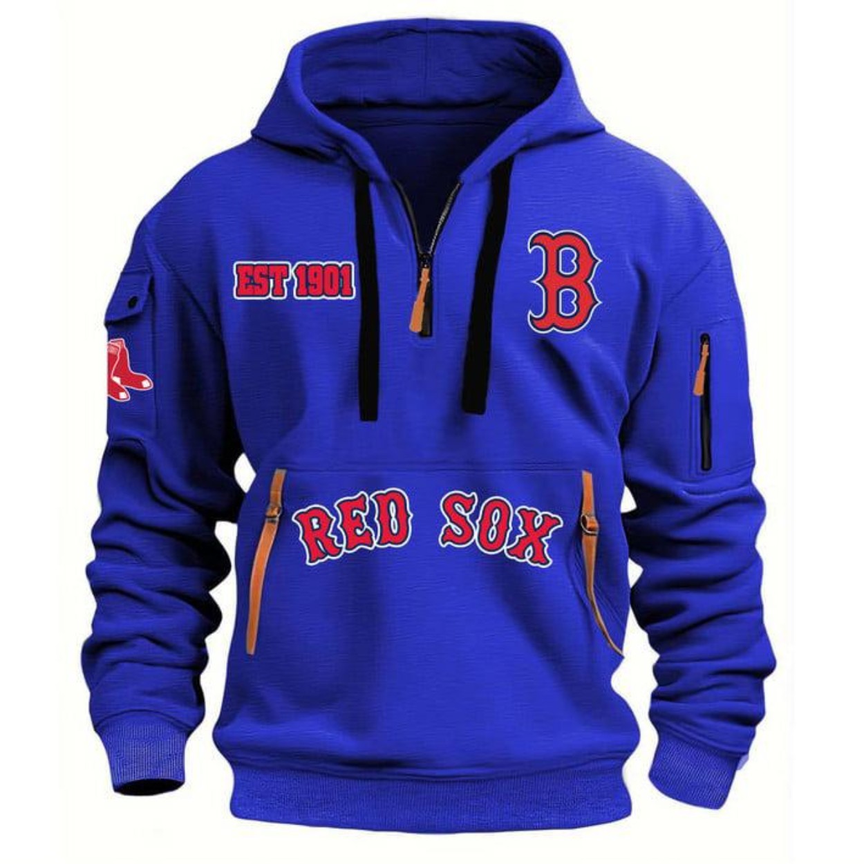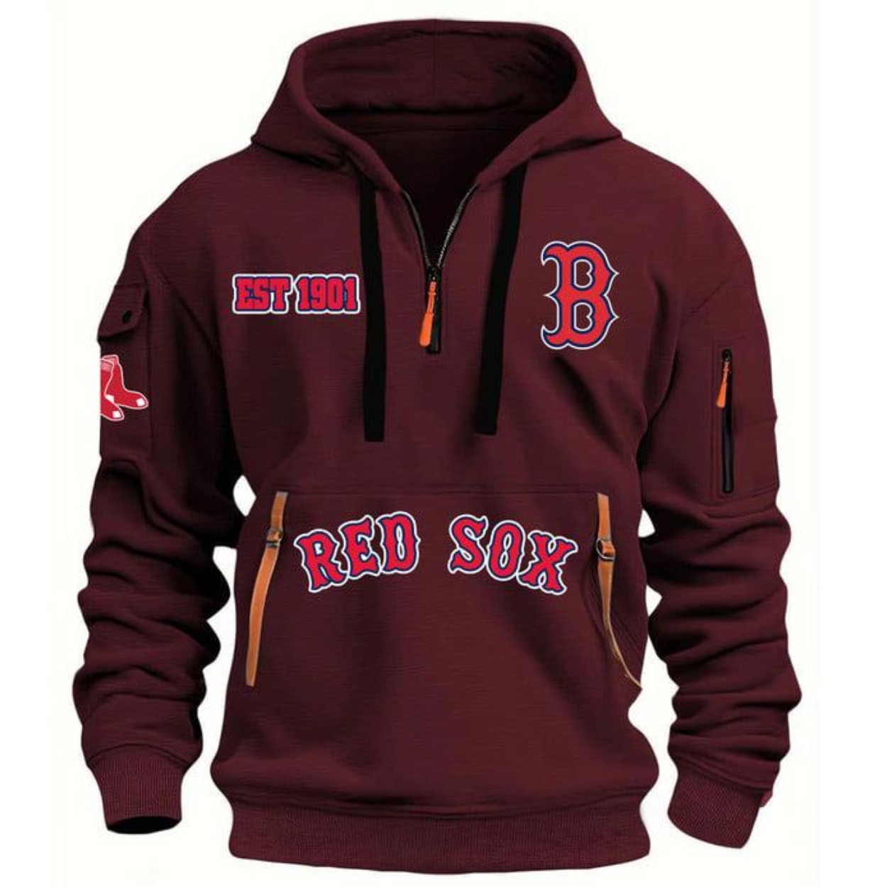 Step up to the plate in comfort and style with our Red Sox EST 1901 Quarter-Zip Hoodie. This hoodie is more than just fan gear; it’s a statement of your unwavering support for the legendary Boston Red Sox. Crafted from high-quality polyester, this hoodie offers a perfect blend of durability and comfort, making it ideal for game day, a cool evening out, or simply lounging at home. With a range of sizes from S to 6XL, every fan can find the perfect fit to showcase their loyalty. The distinctive “EST 1901” and “RED SOX” lettering, along with the iconic “B” and Red Sox logo, are boldly displayed, ensuring your team spirit is always front and center.