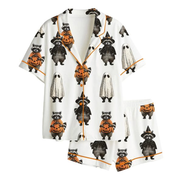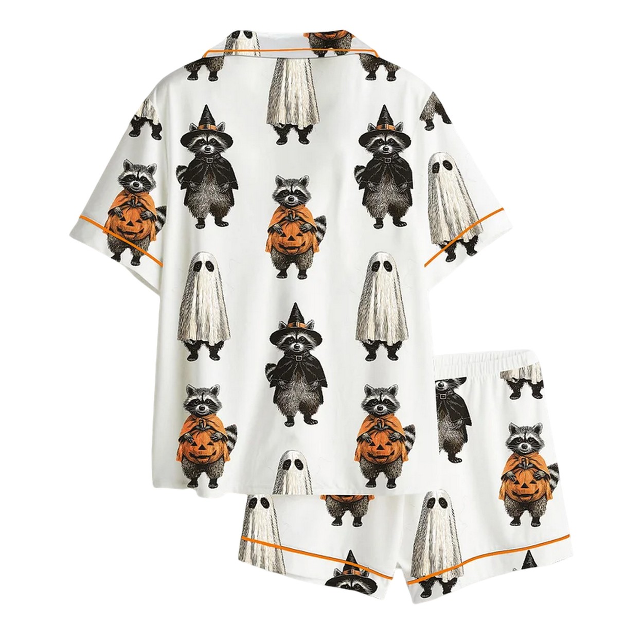 The set boasts a playful print with raccoons in ghostly sheets, carved pumpkins, and witch hats, all rendered in a vintage cartoon style against a light fabric backdrop. The short-sleeve top and matching shorts provide a relaxed silhouette, making it a festive yet comfy choice for the season. To keep the magic alive, machine wash cold, tumble dry low, and avoid bleach or ironing to protect the vibrant illustration. Perfect for Halloween 2025 celebrations!