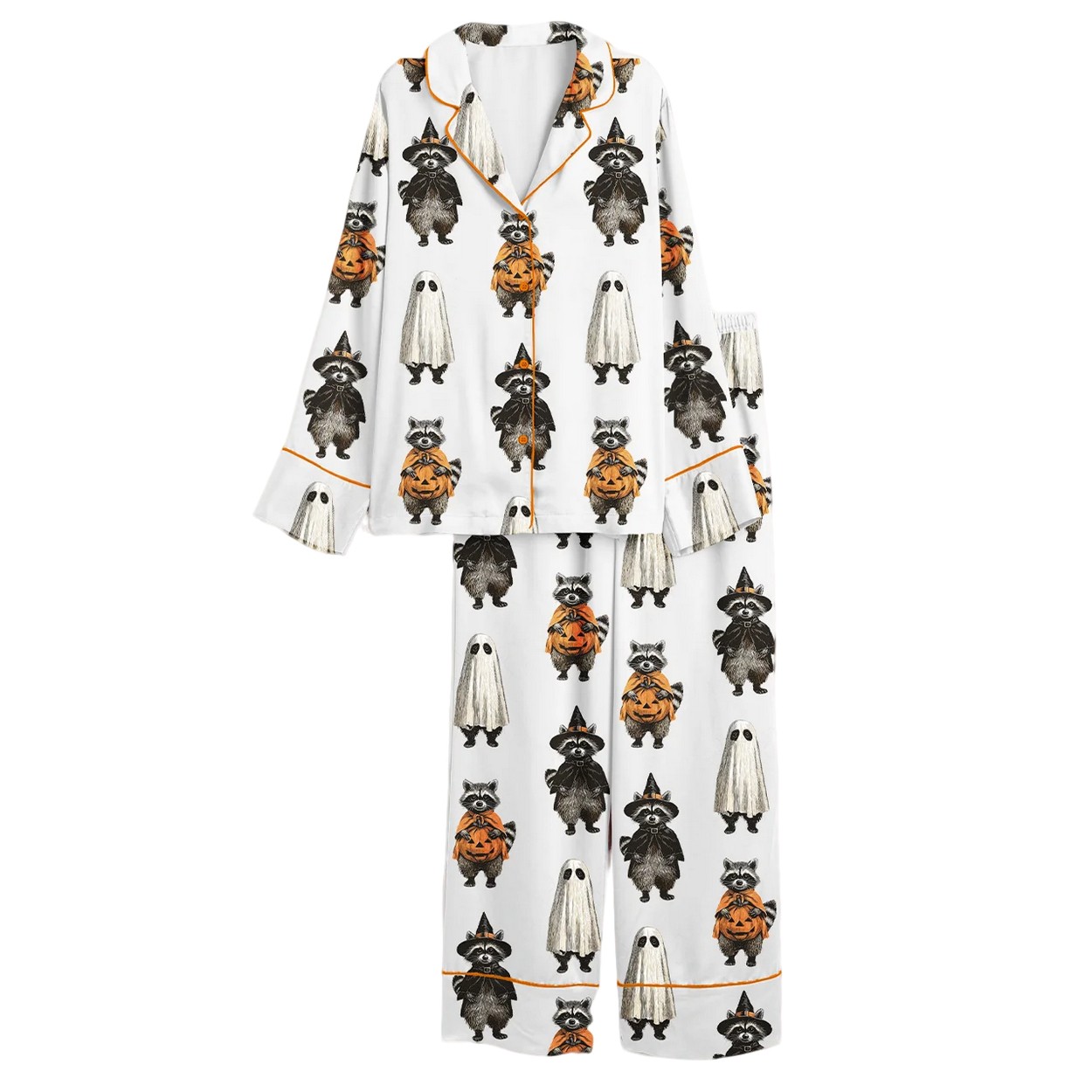 Cute Raccoon Ghost Pajama Set for 2025! Retro raccoons as ghosts & pumpkins on soft polyester-spandex. XS-4XL.