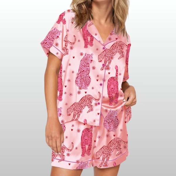Celebrate the season of love with a touch of vintage flair and wild elegance! If you are looking for the perfect blend of romantic charm and playful style, our Retro Valentines Day Silky Satin Pajama Set is your ultimate choice. Featuring a stunning all-over print of pink and red leopards adorned with delicate flowers and hearts, this set brings a unique “retro-chic” vibe to your sleepwear collection. Whether it’s for a cozy Valentine’s night in or just because you love a touch of luxury, these pajamas make every evening feel like a special occasion.