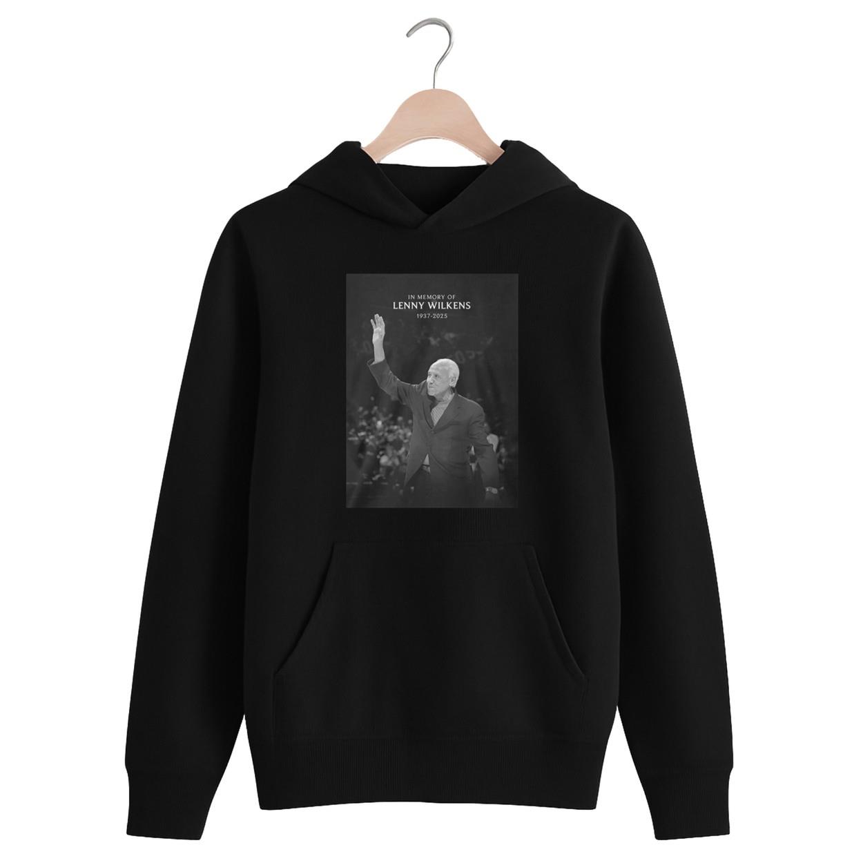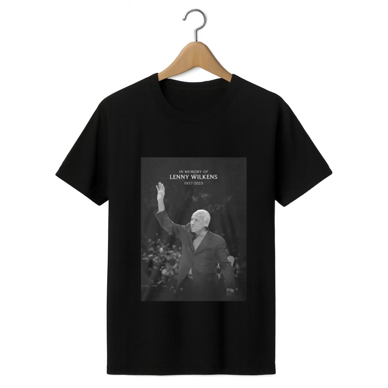 The design is sober and moving, featuring a classic black and white photograph of Lenny Wilkens raising his hand to acknowledge the fans—a poignant image of his connection to the community. Above the photo, the words “IN MEMORY OF” are tastefully printed, followed by “LENNY WILKENS” and his life years, “1937-2025.”