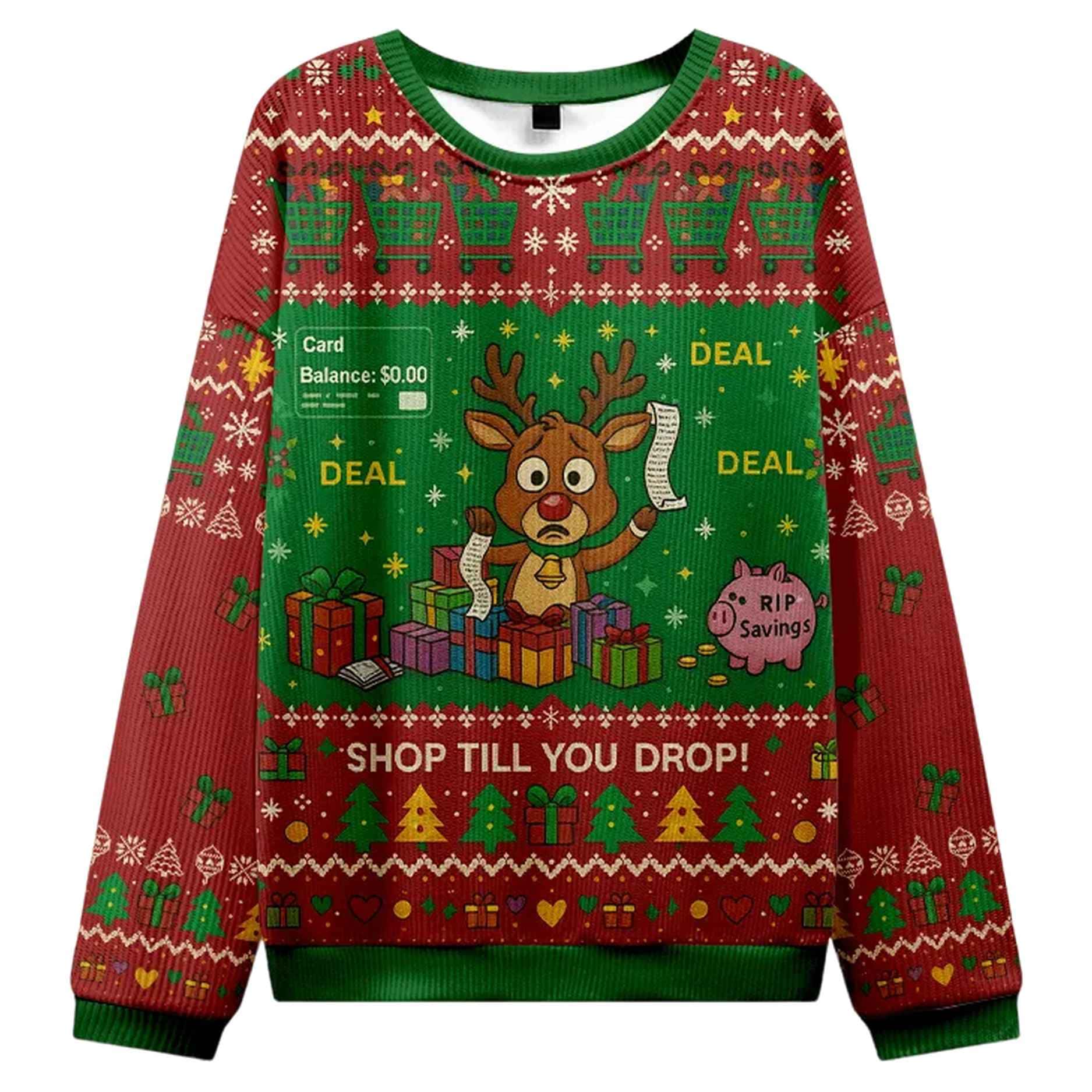 | Design Feature | Full-coverage “ugly sweater” print featuring a panicked reindeer, “Card Balance: $0.00” graphic, and “RIP Savings” tombstone. |
