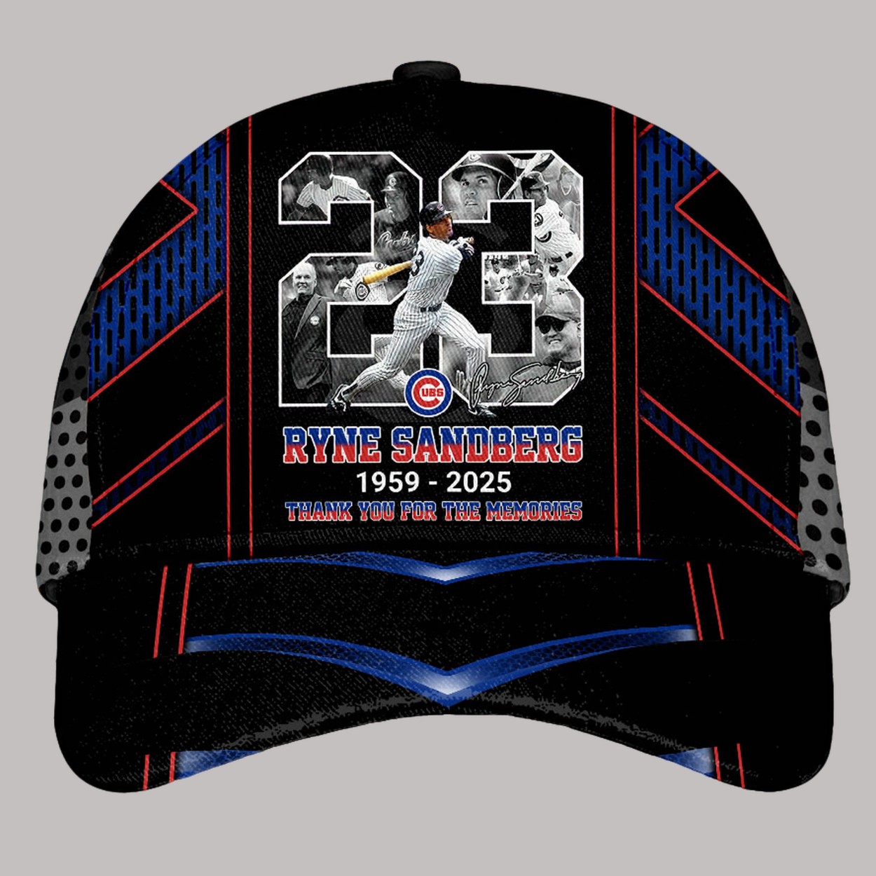 - The cap features a striking collage of Sandberg’s highlights, including his iconic batting pose, surrounded by the number 23 and his signature.
