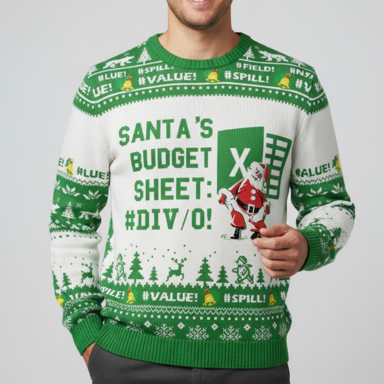- The traditional Fair Isle-style borders are hilariously corrupted by notorious spreadsheet error codes like #VALUE!, #SPILL!, #CALC!, and #FIELD!. These “error bars” are interspersed with festive images of Christmas trees, snowmen, reindeer, and polar bears.