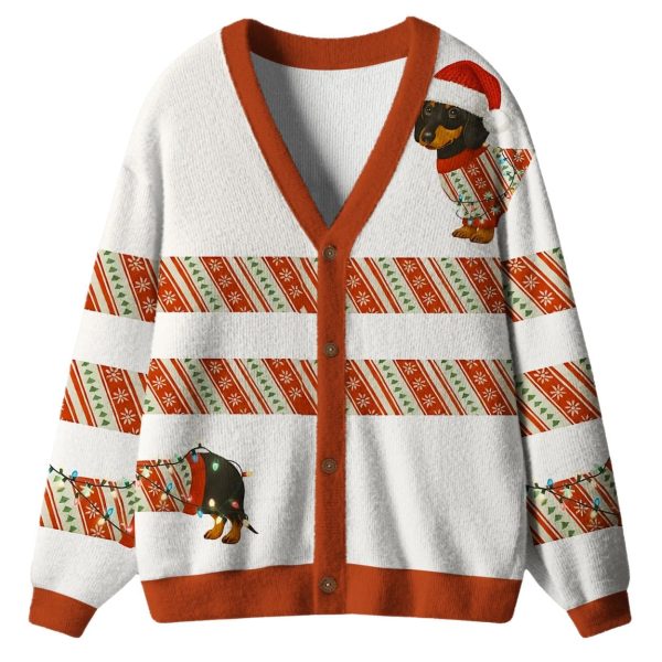- The Main Motif: The entire garment is covered in repeating illustrations of an adorable Dachshund, dressed in a Santa hat and red boots, sometimes tangled in Christmas lights or standing amidst candy cane stripes and holly.