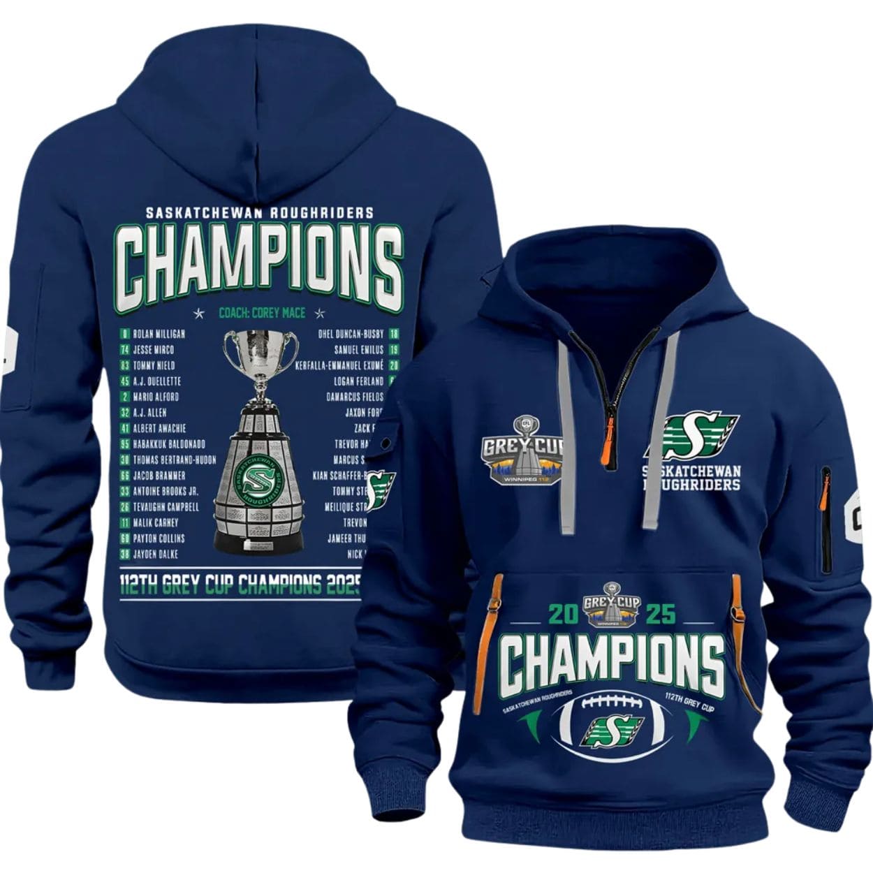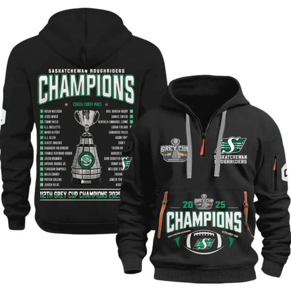 Celebrate the triumph of the Green and White with the Saskatchewan Roughriders 2025 Grey Cup Champions Quarter Zip Hoodie! This commemorative apparel is the ultimate way to honor the team’s incredible victory at the 112th Grey Cup.