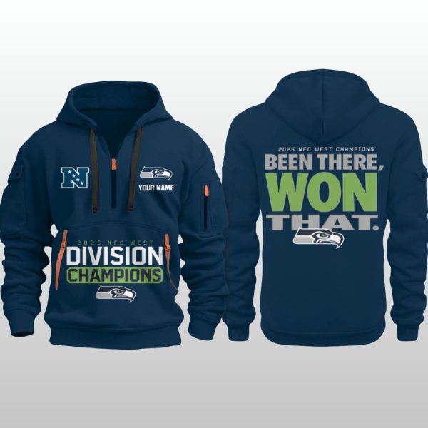 The front features “2025 NFC West Division Champions” branding along with the NFC and Seahawks logos, while the back displays a bold “Been There, Won That” graphic.