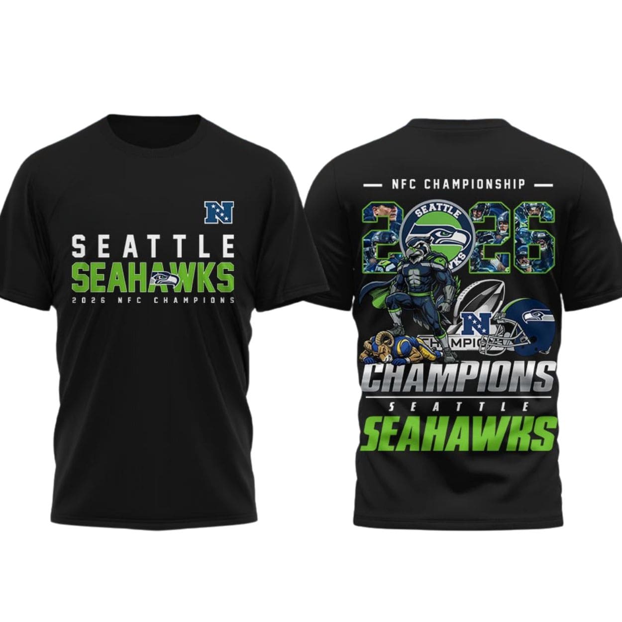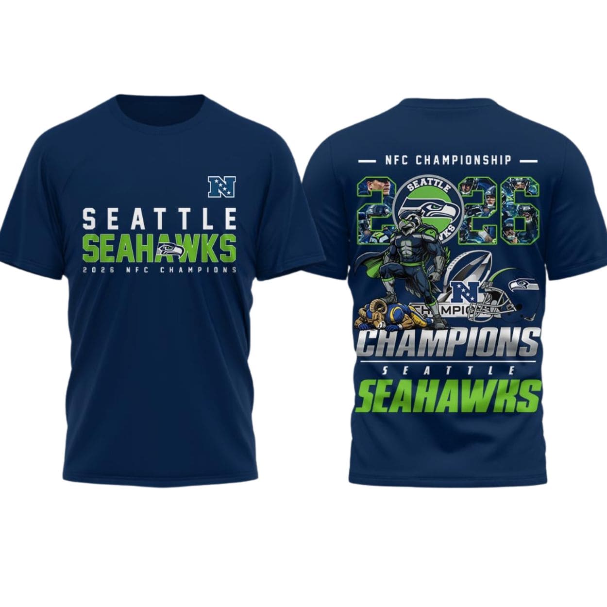 You will love the dynamic, dual-sided design that features high-definition prints of the 2026 NFC Champions title. The front showcases the iconic Seahawks logo and “NFC Champions” text, while the back is packed with vibrant championship graphics, including the 2026 date and celebratory player imagery. Available in classic navy, white, and black, there is a style for every type of fan.