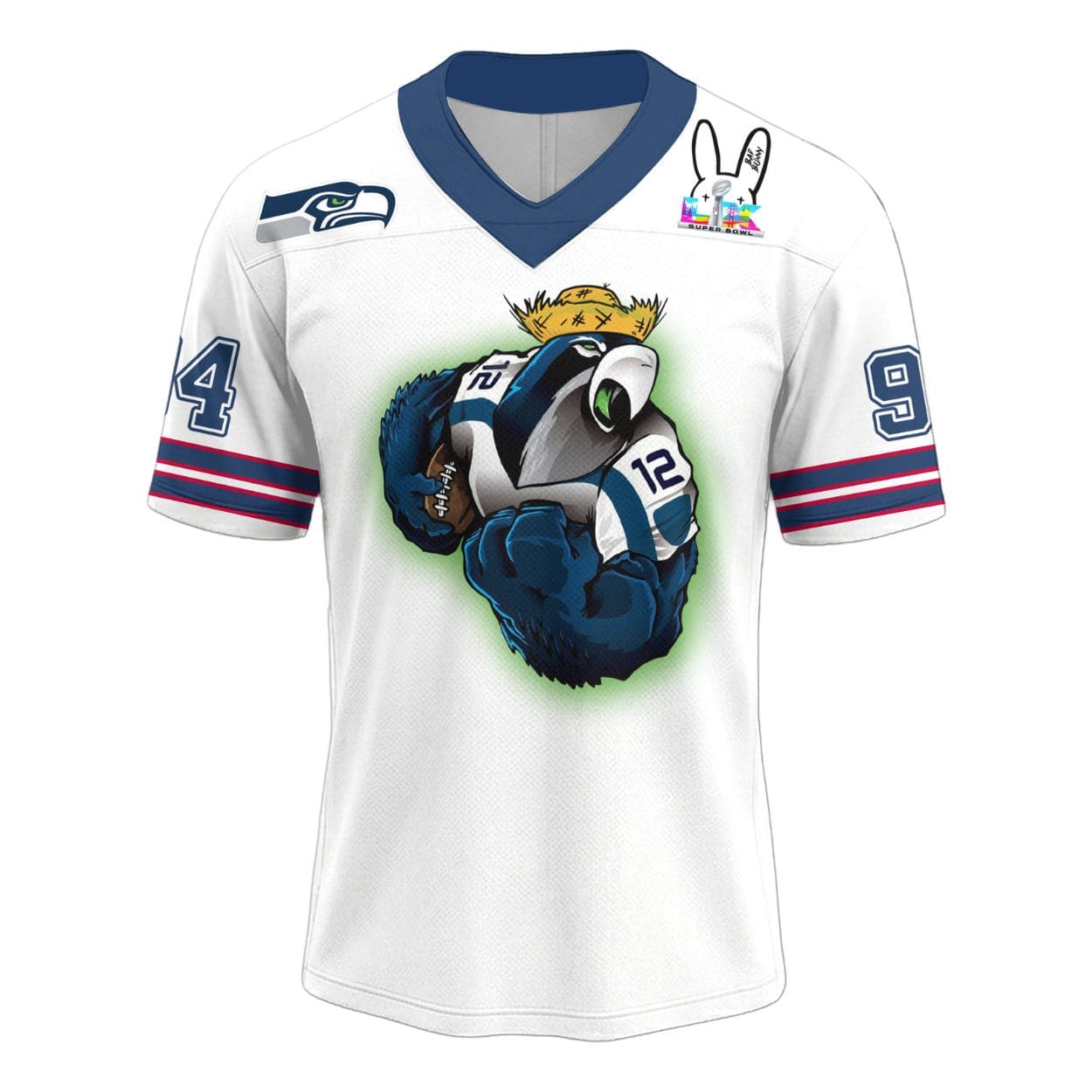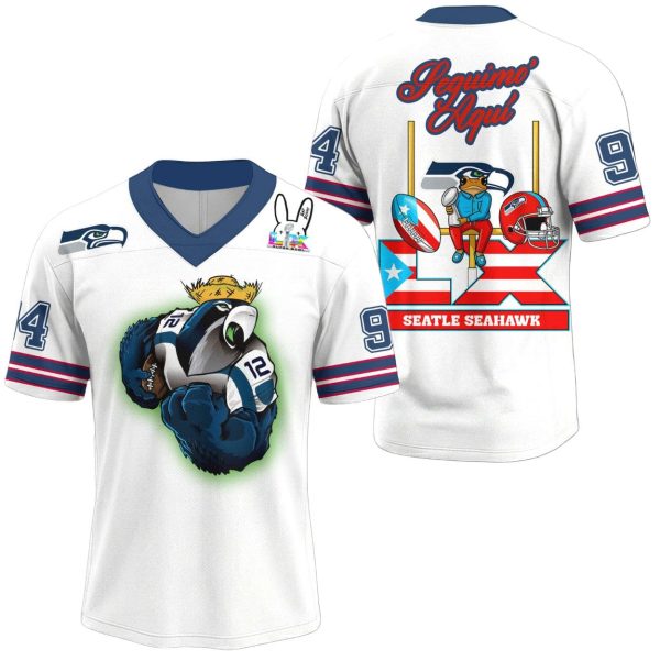 Step into the spotlight with the Seahawks Benito Bowl LX Football Jersey. This unique piece of fan gear is a vibrant celebration that merges the world of Seattle football with a rich, tropical aesthetic. Inspired by the road to LX and “Benito” vibes, this white jersey features bold graphics, including a fierce hawk in a straw hat and iconic Puerto Rican cultural symbols. It’s the ultimate statement piece for the “12s” who want to represent their team with a global, artistic flair.
