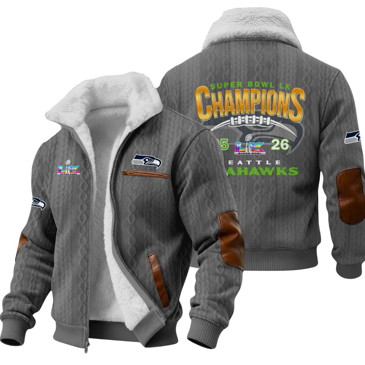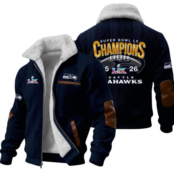 Sophisticated Styling: The exterior boasts a unique cable-knit texture in deep Seahawks navy, complemented by premium brown leather-style accents on the pockets and elbow patches.