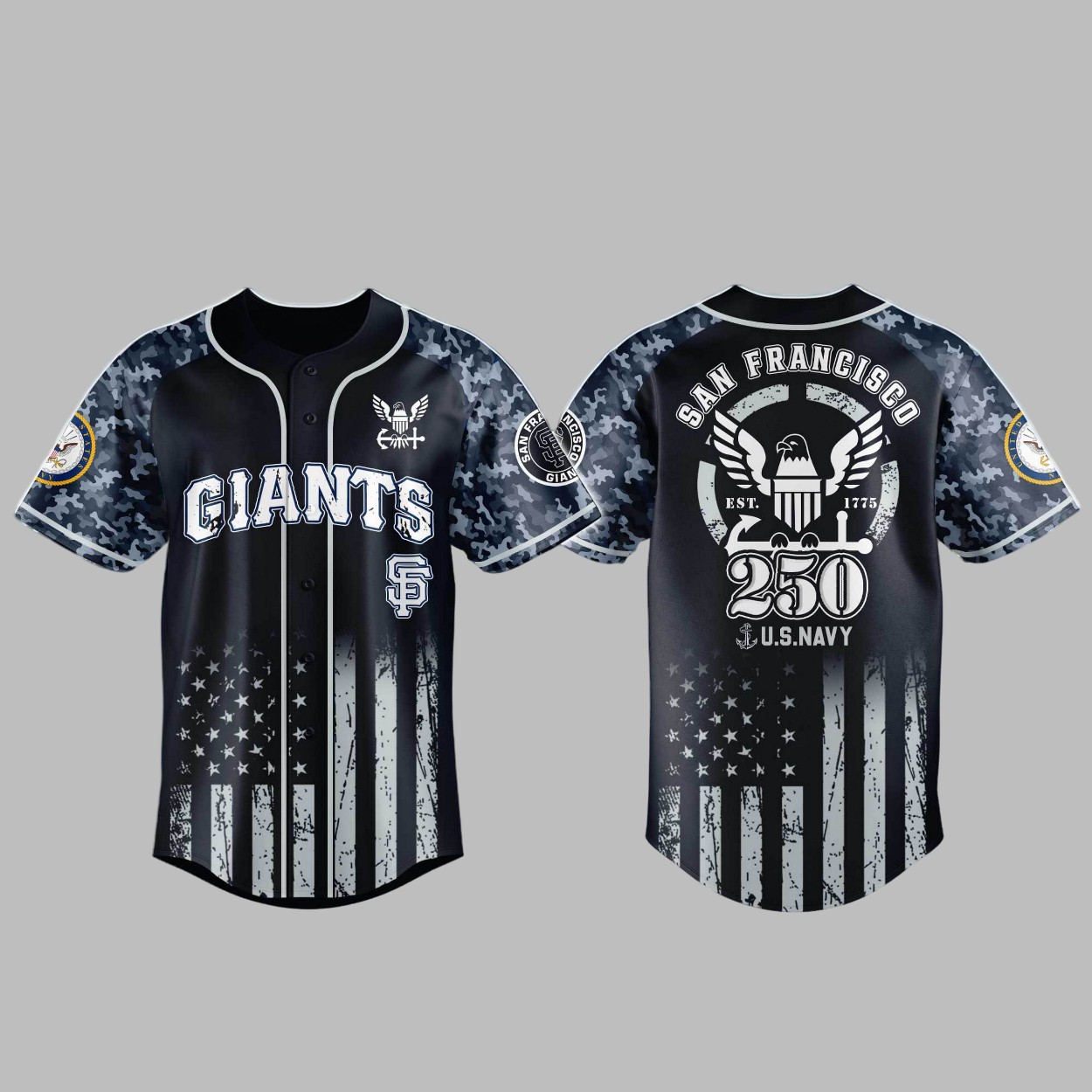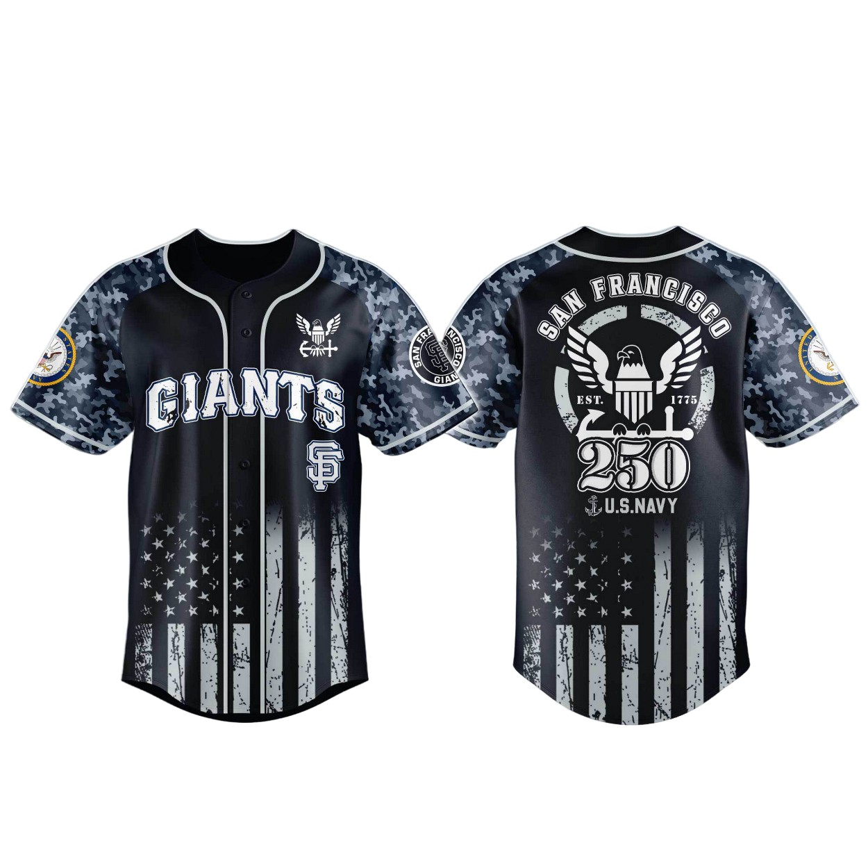 Celebrate 250 yrs of U.S. Navy with this SF Giants jersey! Sizes S-6XL, polyester, camo & flag design. Perfect for fans. Order now!