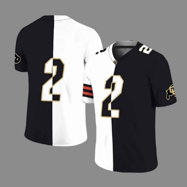 Design Details: Features a unique half-and-half split design, combining the iconic black and gold of the Buffaloes with the bold aesthetic of the Browns. Includes number 2 on front and back, along with team logos and accents on the sleeves.