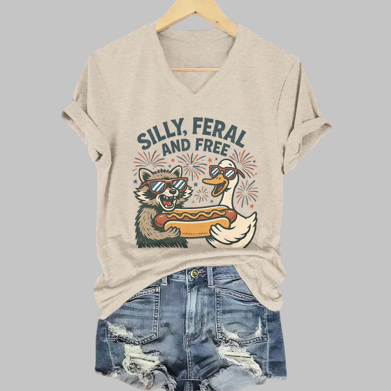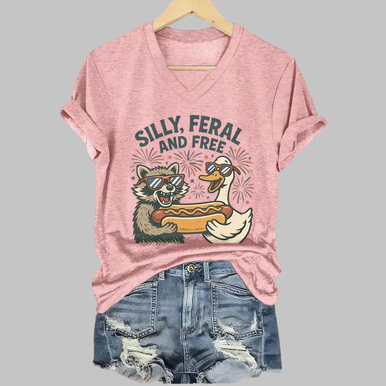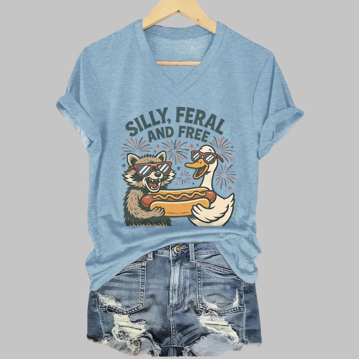 The Silly Feral And Free Print Casual V-Neck T-Shirt is the perfect pick for those who live life on the wild and witty side. With a raccoon and duck duo sharing a hot dog under a burst of fireworks, this hilarious design is made for carefree spirits with a bold sense of humor.