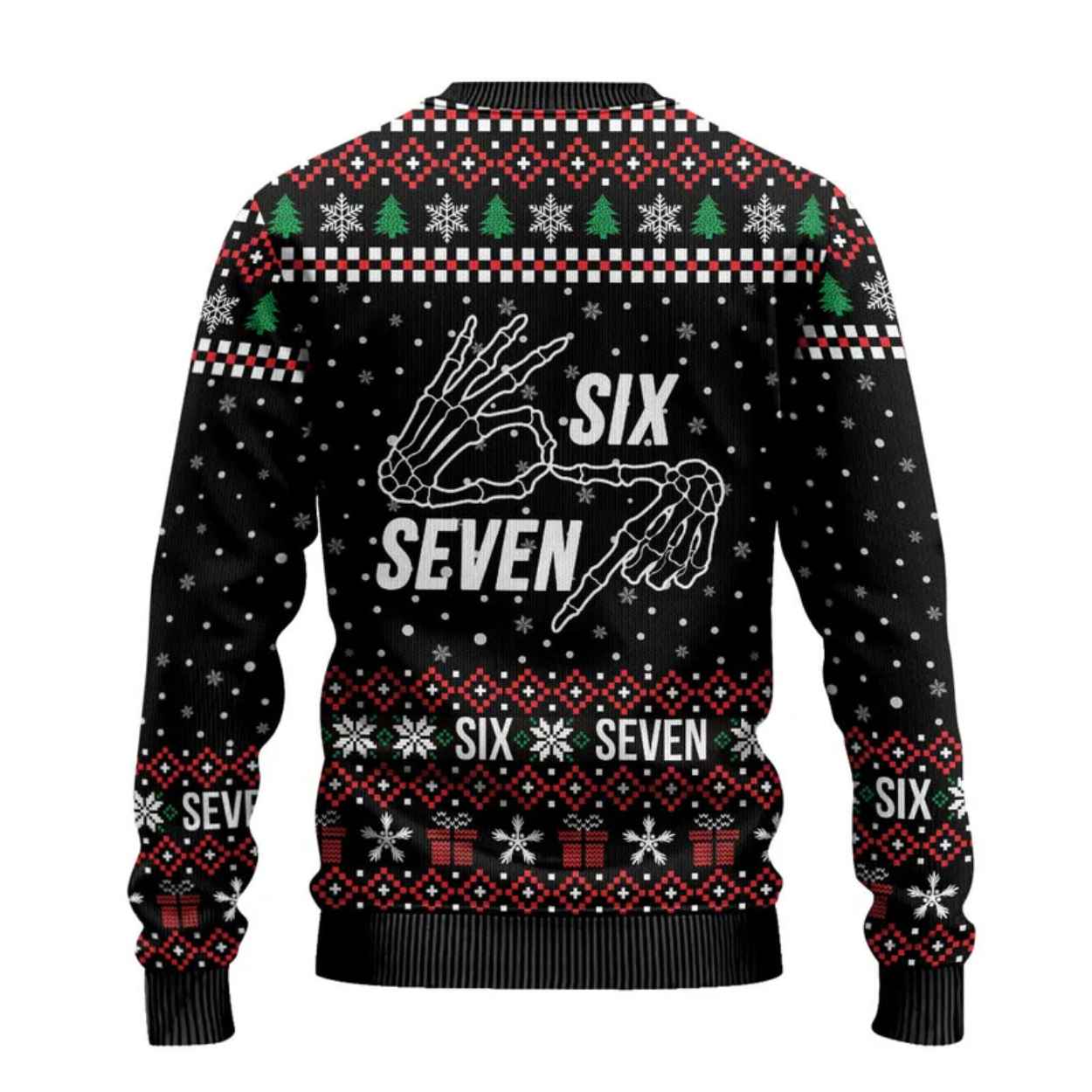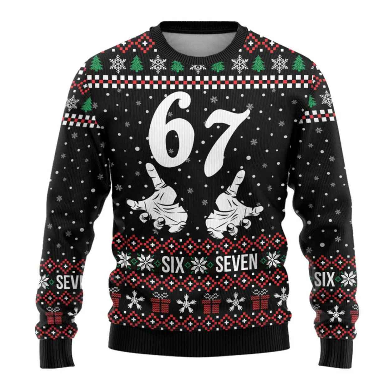 | Design Feature | Double-sided “ugly sweater” print featuring the “67” number (Front) and the Skeleton Hand “SIX SEVEN” gesture (Back), amidst festive patterns. |