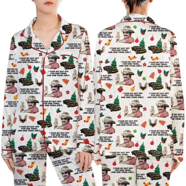 Celebrate the open road, high speed, and classic cinema this holiday season with the Smokey And The Bandit I Take My Hat Off Pajamas Set! This unique sleepwear blends the high-octane fun of the iconic Burt Reynolds film with festive Christmas flair.