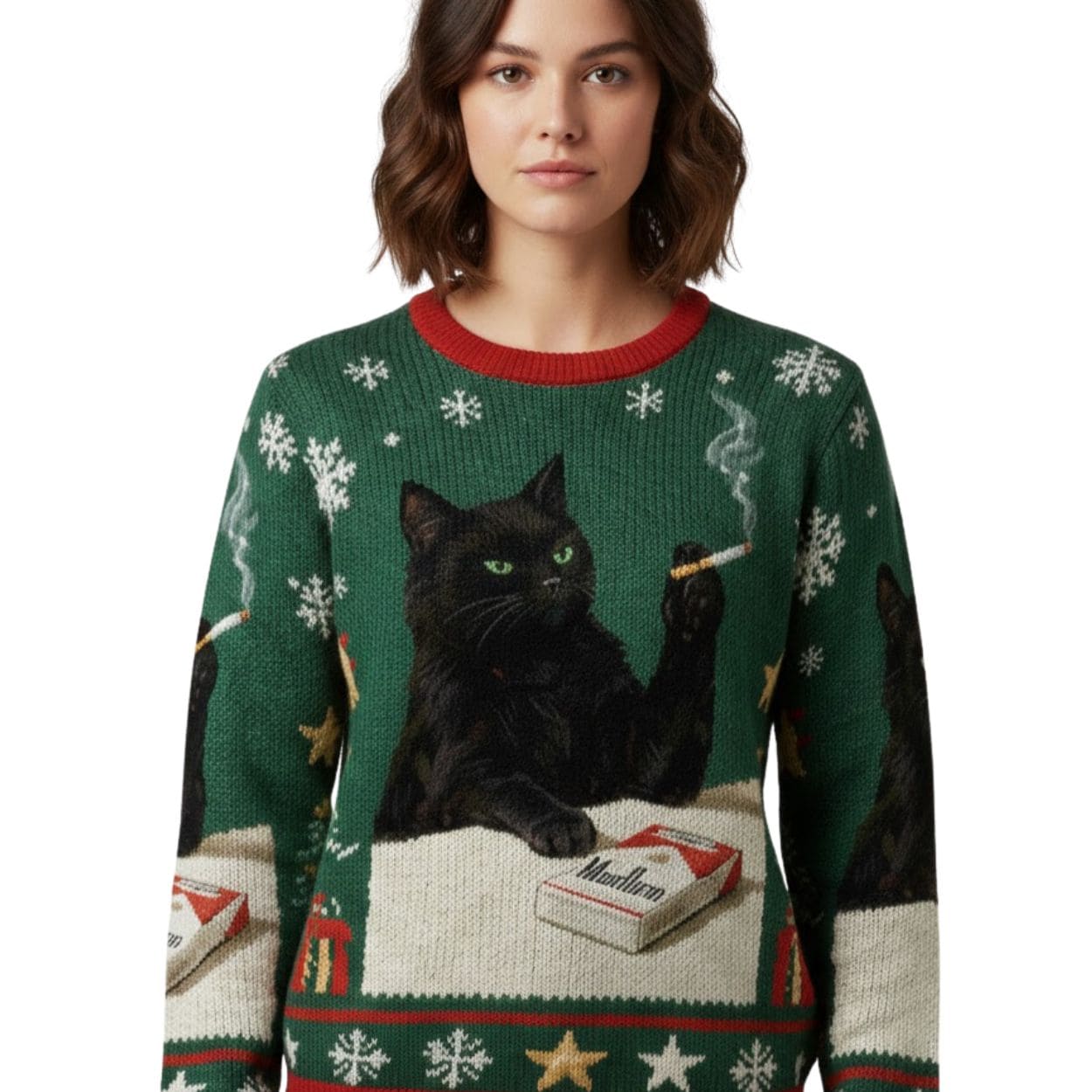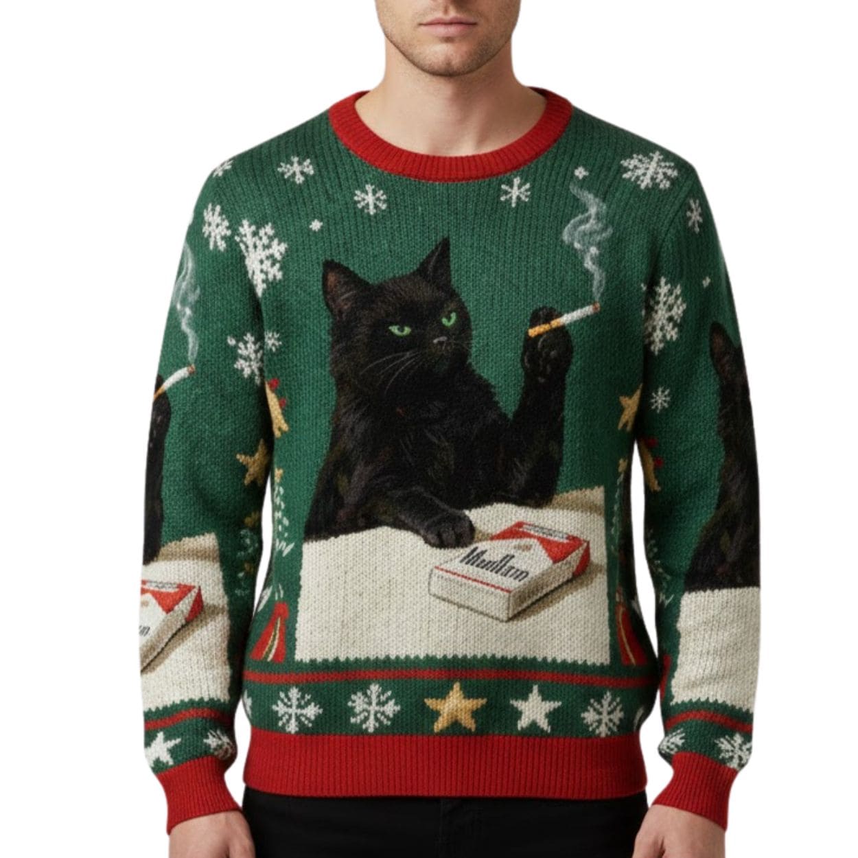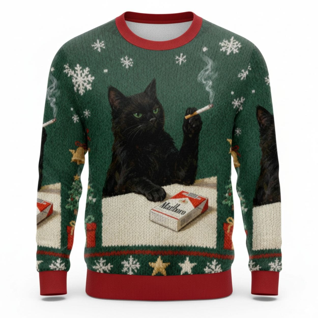 The design features a festive forest green and red traditional knit pattern, complete with holiday motifs like snowflakes, jingle bells, and Christmas trees across the sleeves and borders. The centerpiece is a high-definition image of a cool, slightly sinister black cat with intense green eyes. The cat is shown resting its paw on a pack of Marlboro cigarettes while holding and smoking a cigarette with a sophisticated air.