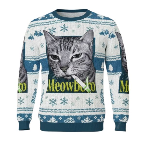 This sweater skillfully blends classic “ugly Christmas sweater” style with a truly original, funny graphic. The design features a cool blue and white traditional pattern, complete with festive motifs like snowflakes and geometric borders. The centerpiece is a large, high-definition image of a cool, slightly cynical tabby cat with a relaxed expression. The cat is shown casually puffing on a hand-rolled cigarette, and the brand name below is humorously rendered as “Meowboro” in bold, contrasting green and yellow text. Repeating cat faces are subtly placed on the side panels, ensuring maximum meme impact.