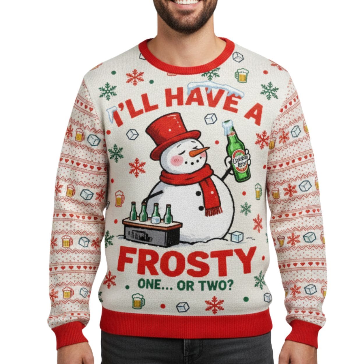 - Above and below the snowman, the bold, red text delivers the perfect, witty slogan: “I’LL HAVE A FROSTY ONE… OR TWO?”