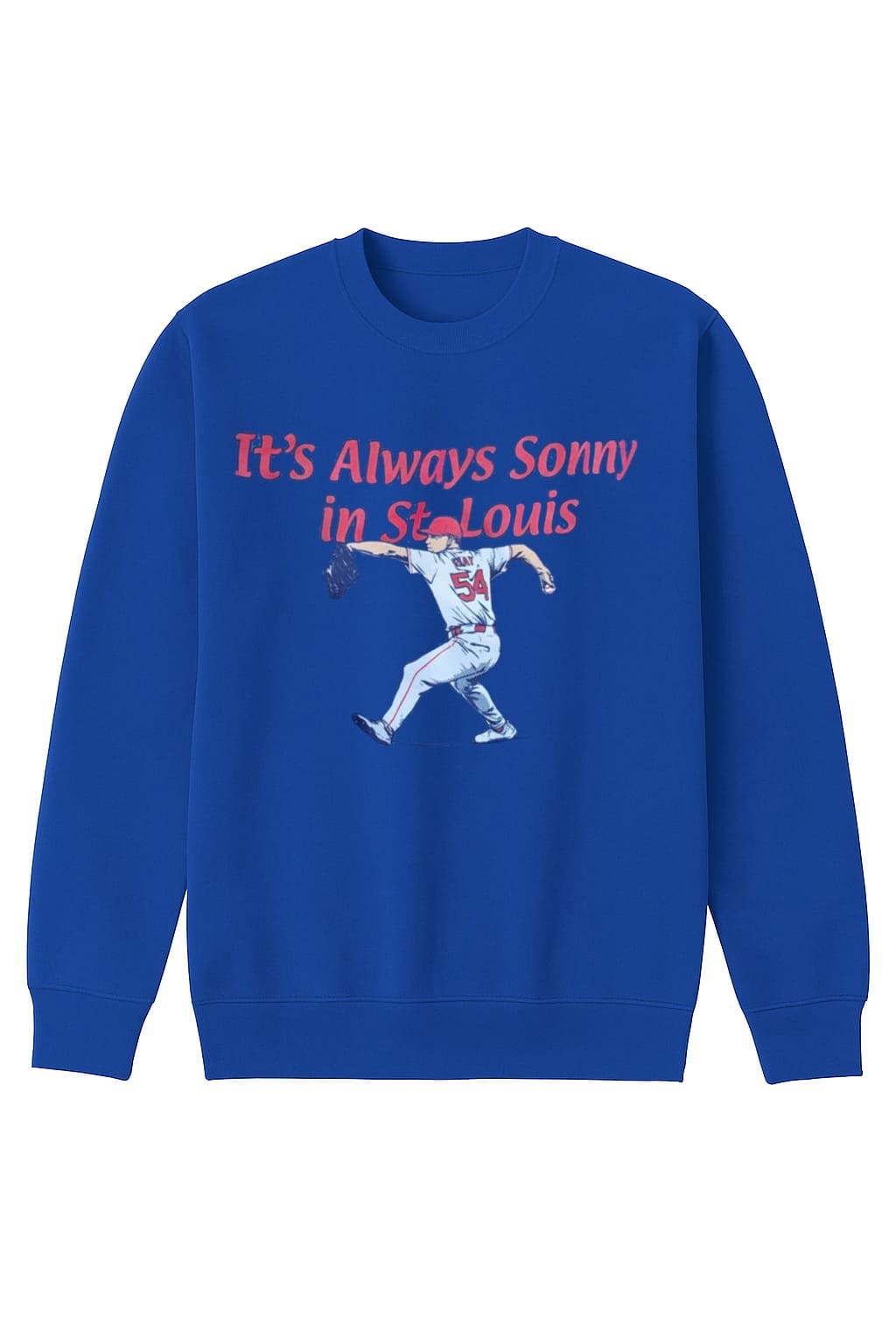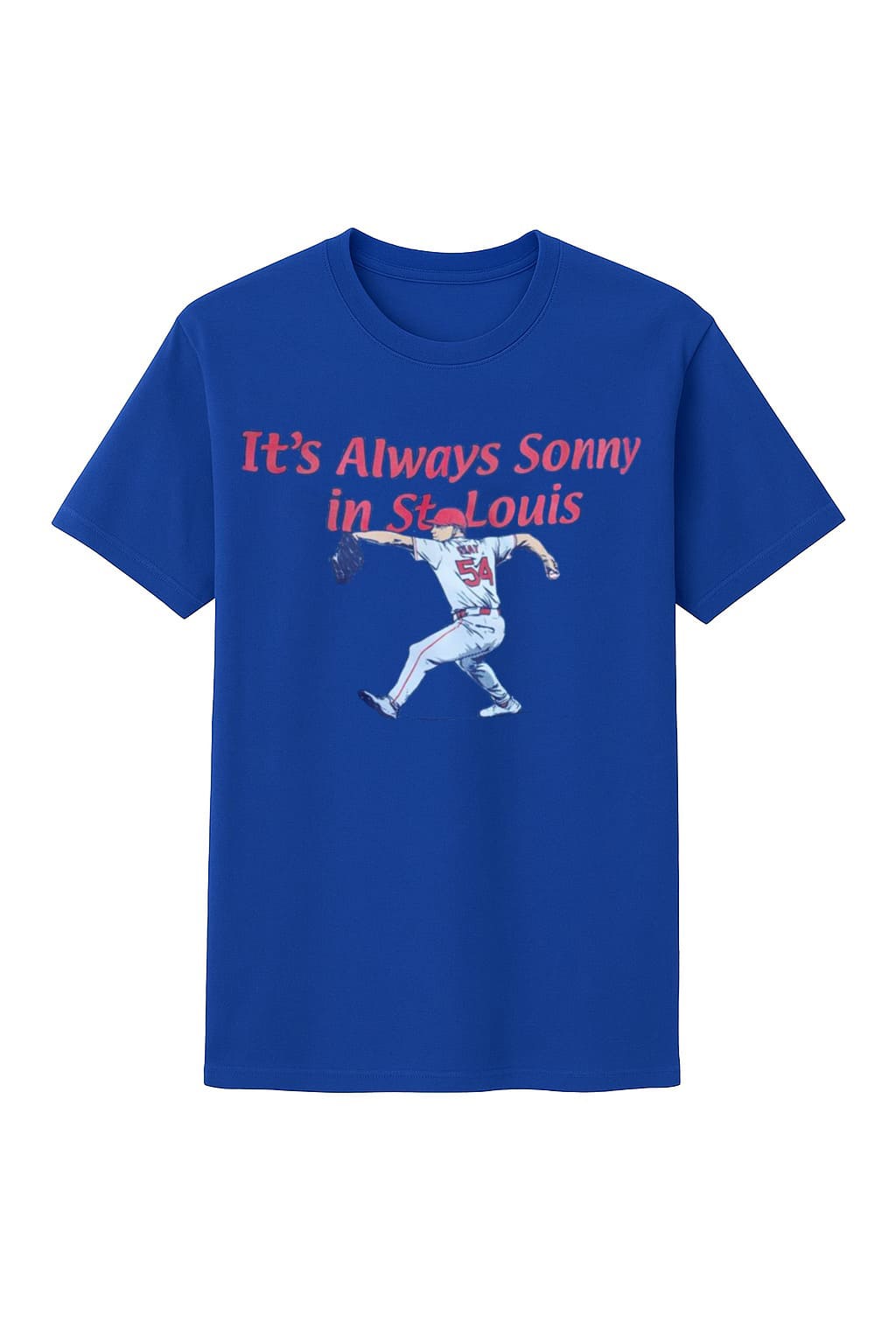 Celebrate Sonny Gray’s stellar presence with the “Sonny Gray It’s Always Sonny in St Louis Shirt.” This vibrant blue tee, available in sizes S to 5XL, is crafted from a comfortable cotton-polyester blend, offering durability and a soft fit. The design features a dynamic illustration of Sonny Gray in his pitching stance, wearing his Cardinals uniform with the number 54, paired with the catchy phrase “IT’S ALWAYS SONNY IN ST LOUIS” in bold red lettering. Perfect for Cardinals fans or anyone who loves a tribute to baseball greatness, this shirt brings St. Louis spirit to every wear.