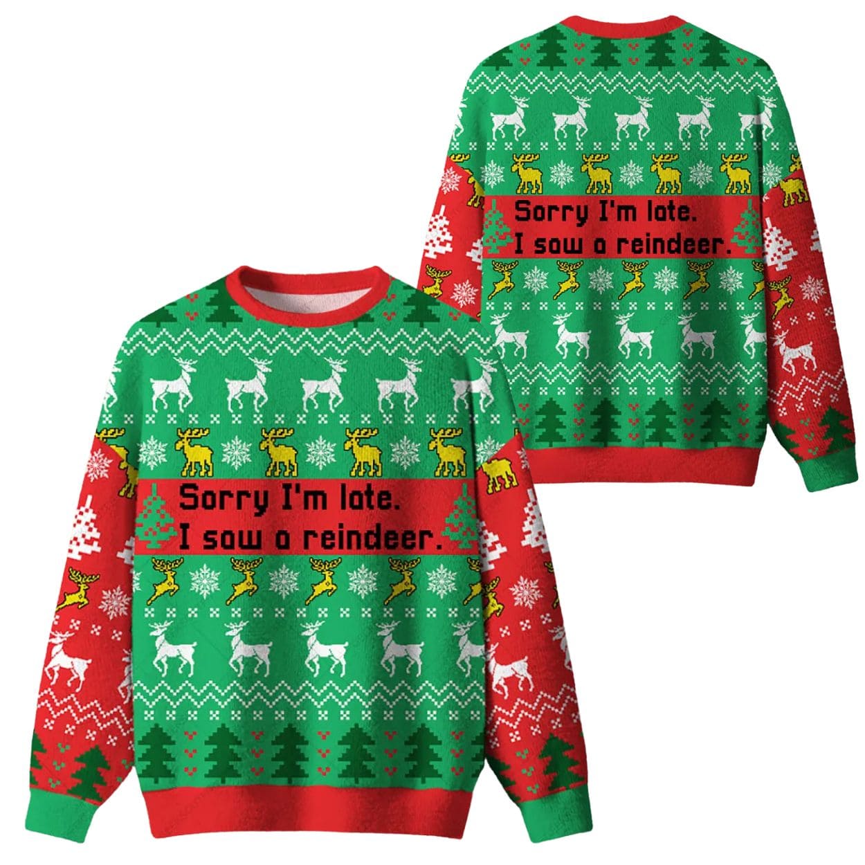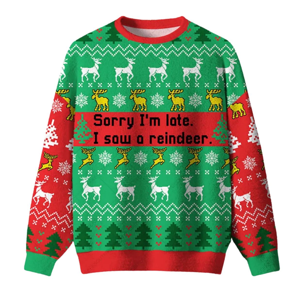 | Design Feature | Full-coverage “ugly sweater” print featuring the humorous slogan: “Sorry I’m late. I saw a reindeer.” amidst reindeer, tree, and snowflake patterns. |