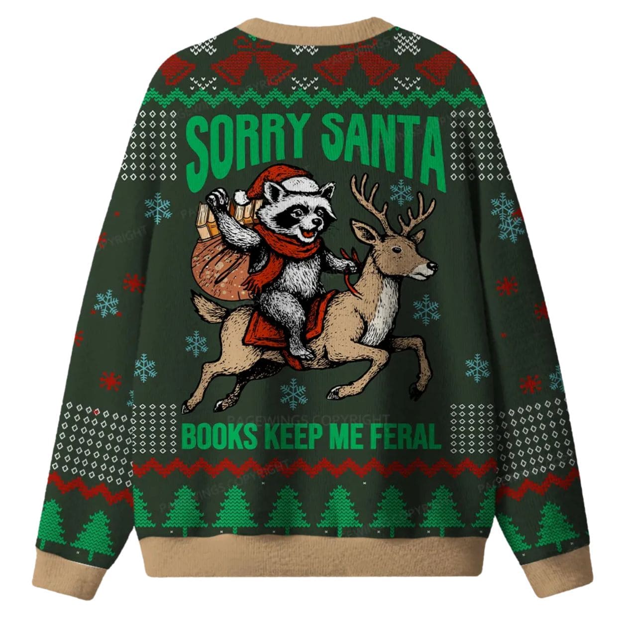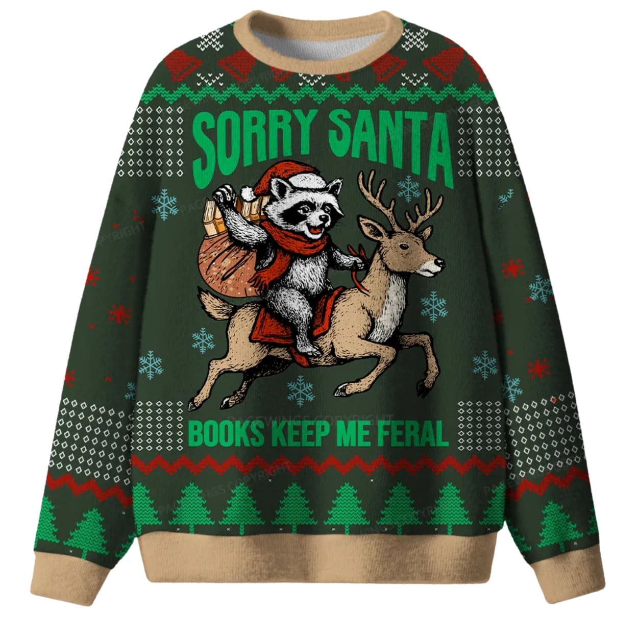 | Design Feature | Full-coverage “ugly sweater” print featuring a raccoon riding a reindeer and the hilarious slogan: “SORRY SANTA, BOOKS KEEP ME FERAL.” |