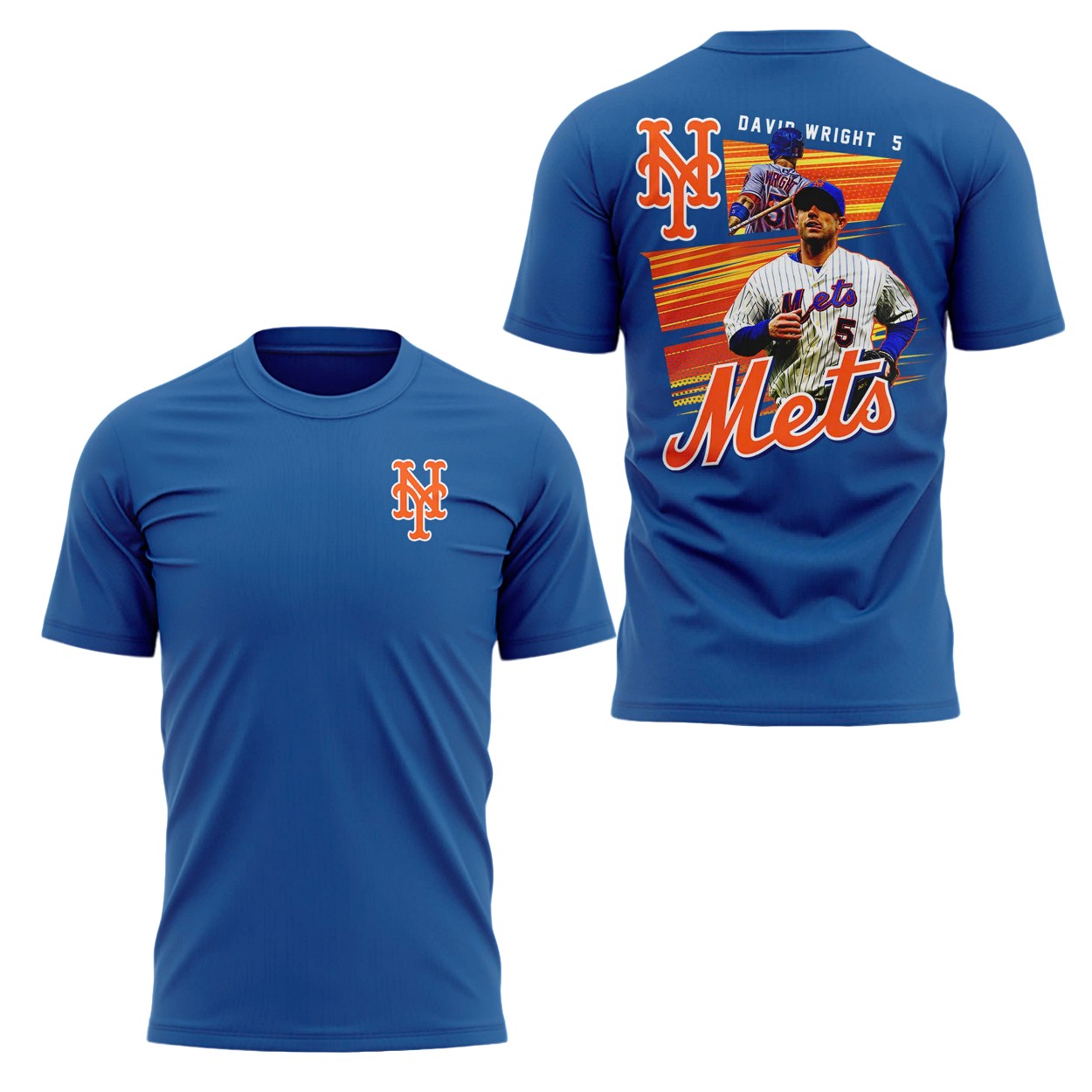 Honor the legacy of David Wright with the Special Mets Block Party David Wright T-Shirt! Crafted from a comfortable cotton-polyester blend, this tee is available in sizes S to 5XL, catering to all fans. The front proudly displays the iconic Mets “NY” logo, while the back features a vibrant design with David Wright’s image, jersey number 5, and the bold “Mets” text against a dynamic orange and blue backdrop. Perfect for block parties, game days, or casual wear, this shirt is a tribute to a Mets icon.