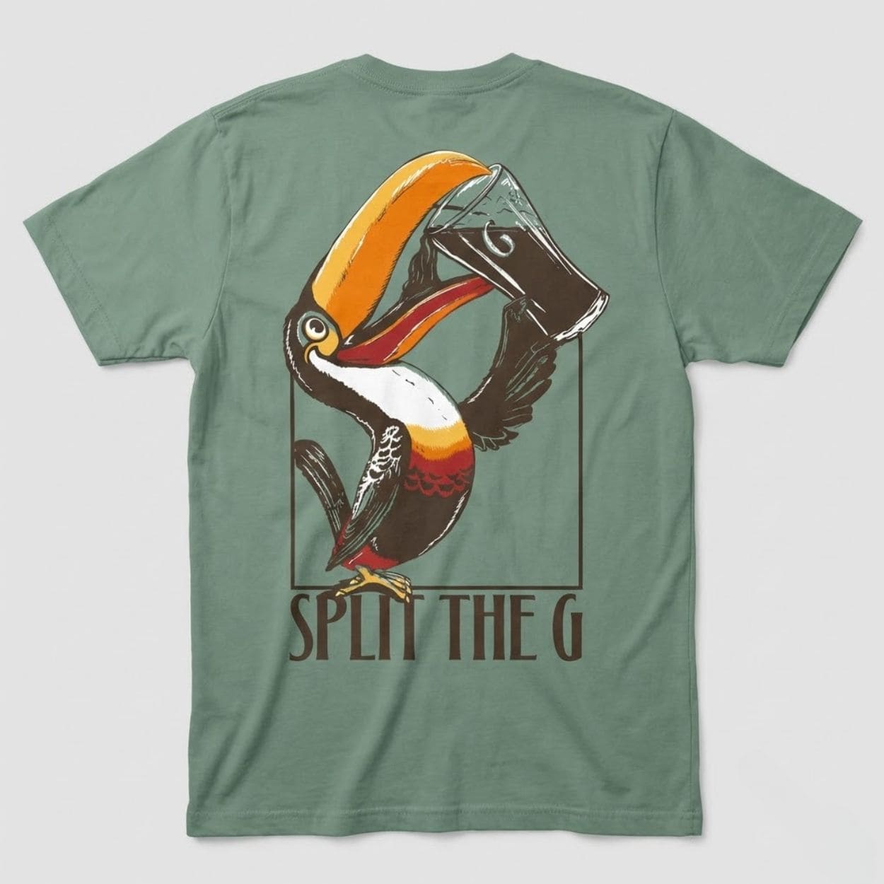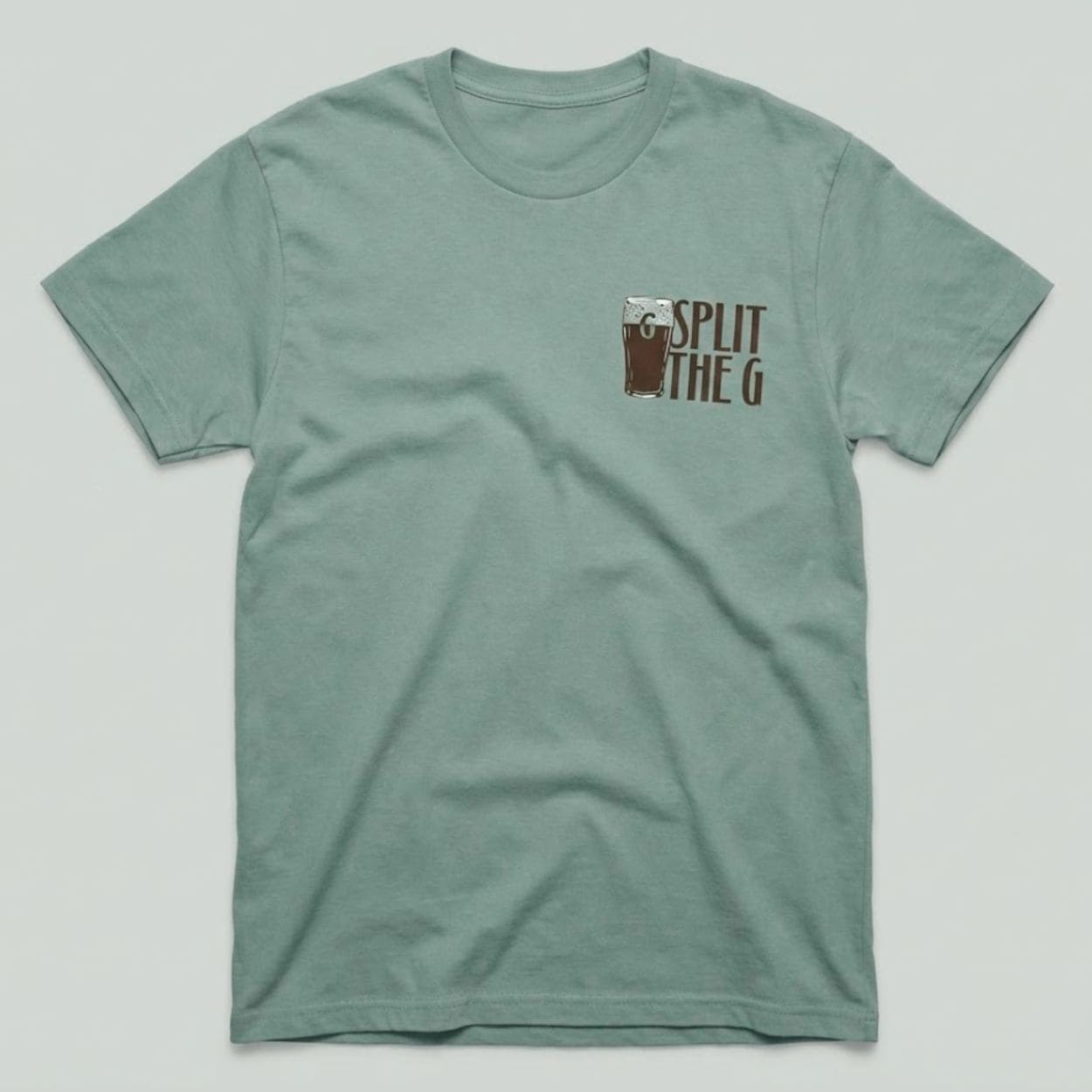 Front: A minimalist chest print featuring a classic pint of stout with the bold “Split the G” call-to-action.