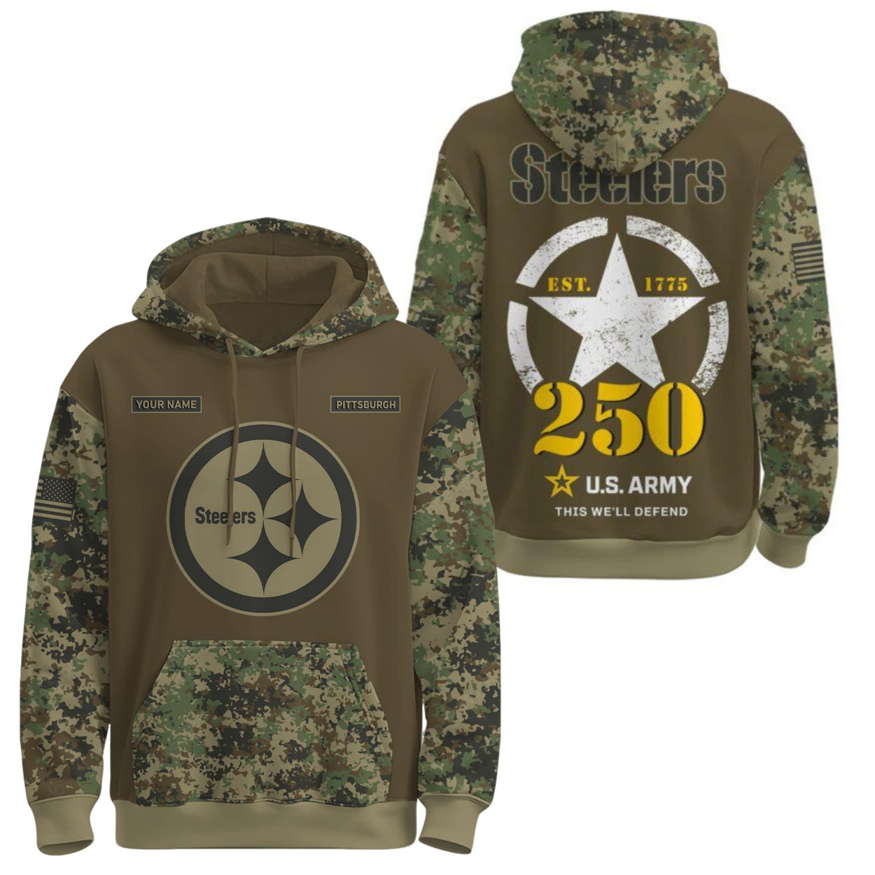 Unite your love for the Pittsburgh Steelers and your respect for the U.S. Army with the ‘Steelers US Army 250th Birthday Hoodie‘.