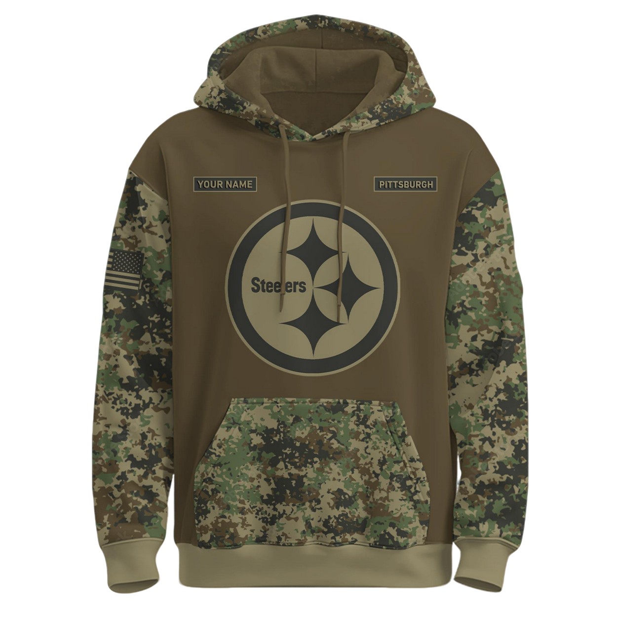 - The front features the iconic Steelers logo, flanked by customizable “YOUR NAME” and “PITTSBURGH” patches, while a U.S. flag patch adorns the sleeve.