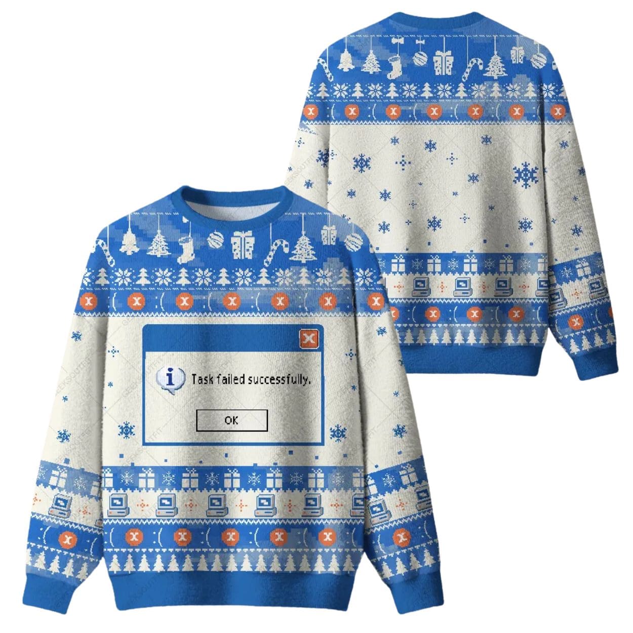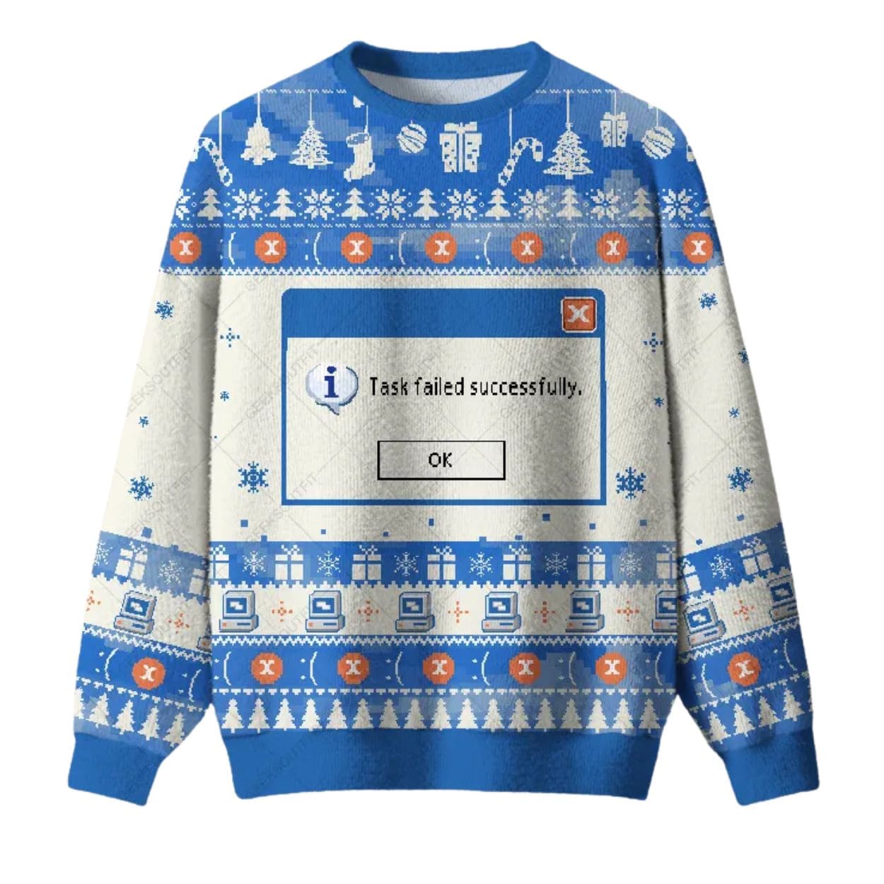 | Design Feature | Full-coverage “ugly sweater” print featuring a large Windows “Task Failed Successfully” error message amidst tech and Christmas motifs. |