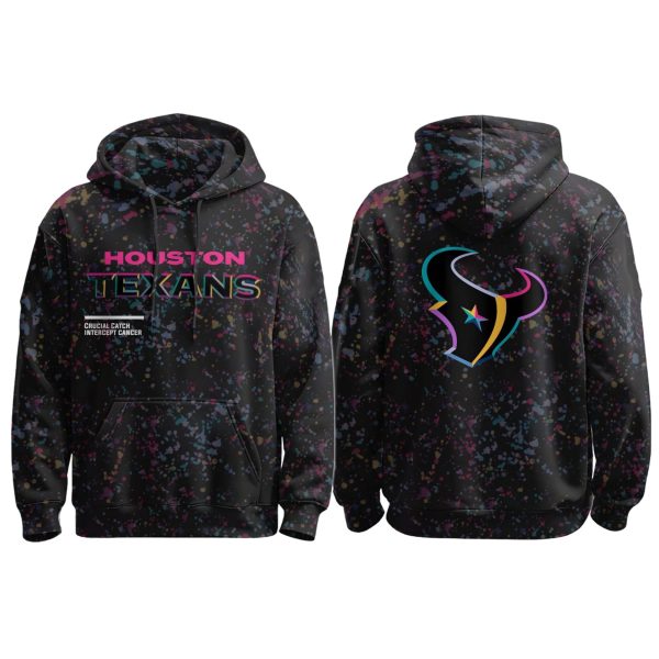 This Texans Crucial Catch 2025 Hoodie features a full-print design on a dark black base, creating a dynamic, street-art inspired look.