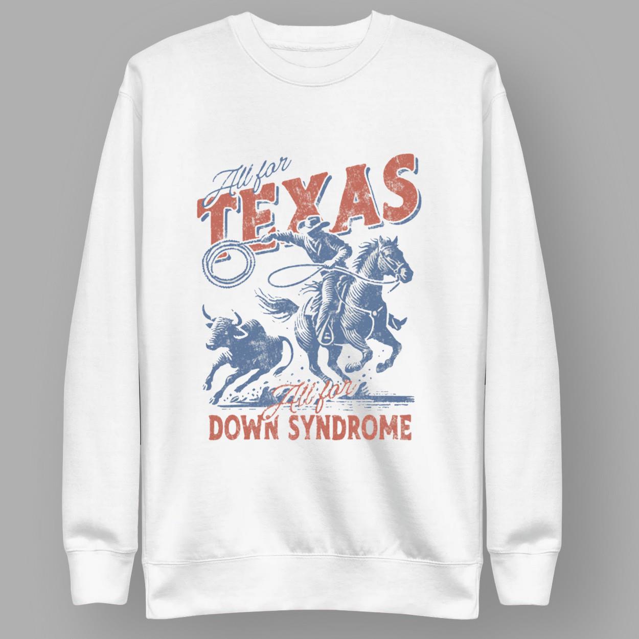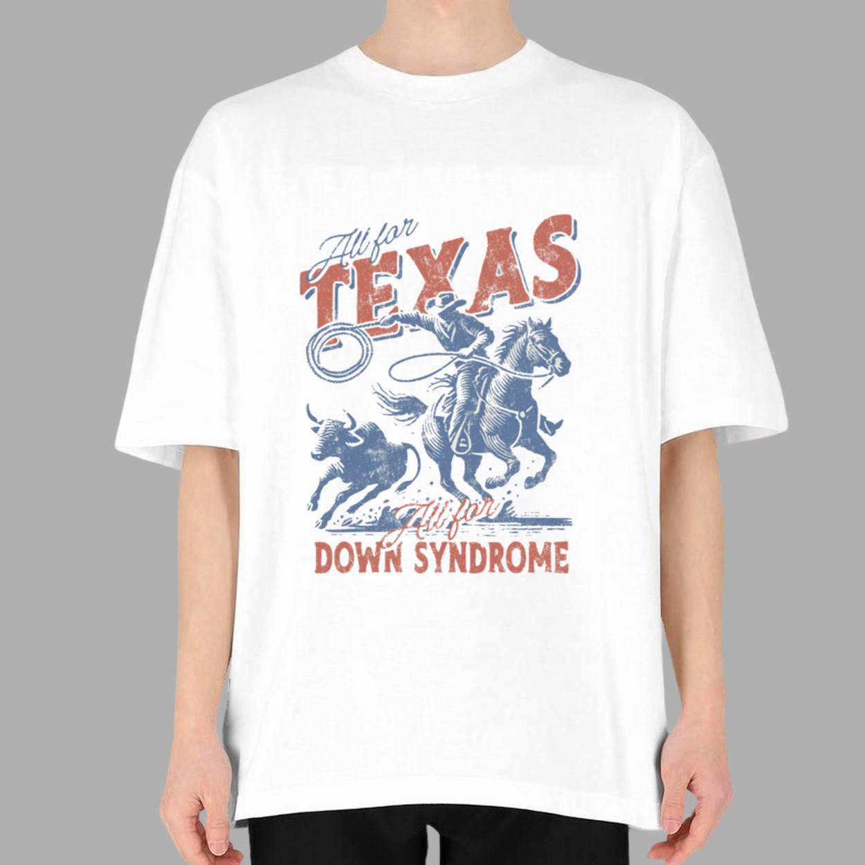 - The design features a vibrant cowboy riding a horse, lassoing a bull, with “All for TEXAS” in bold red and blue lettering and “All for DOWN SYNDROME” in striking red below.