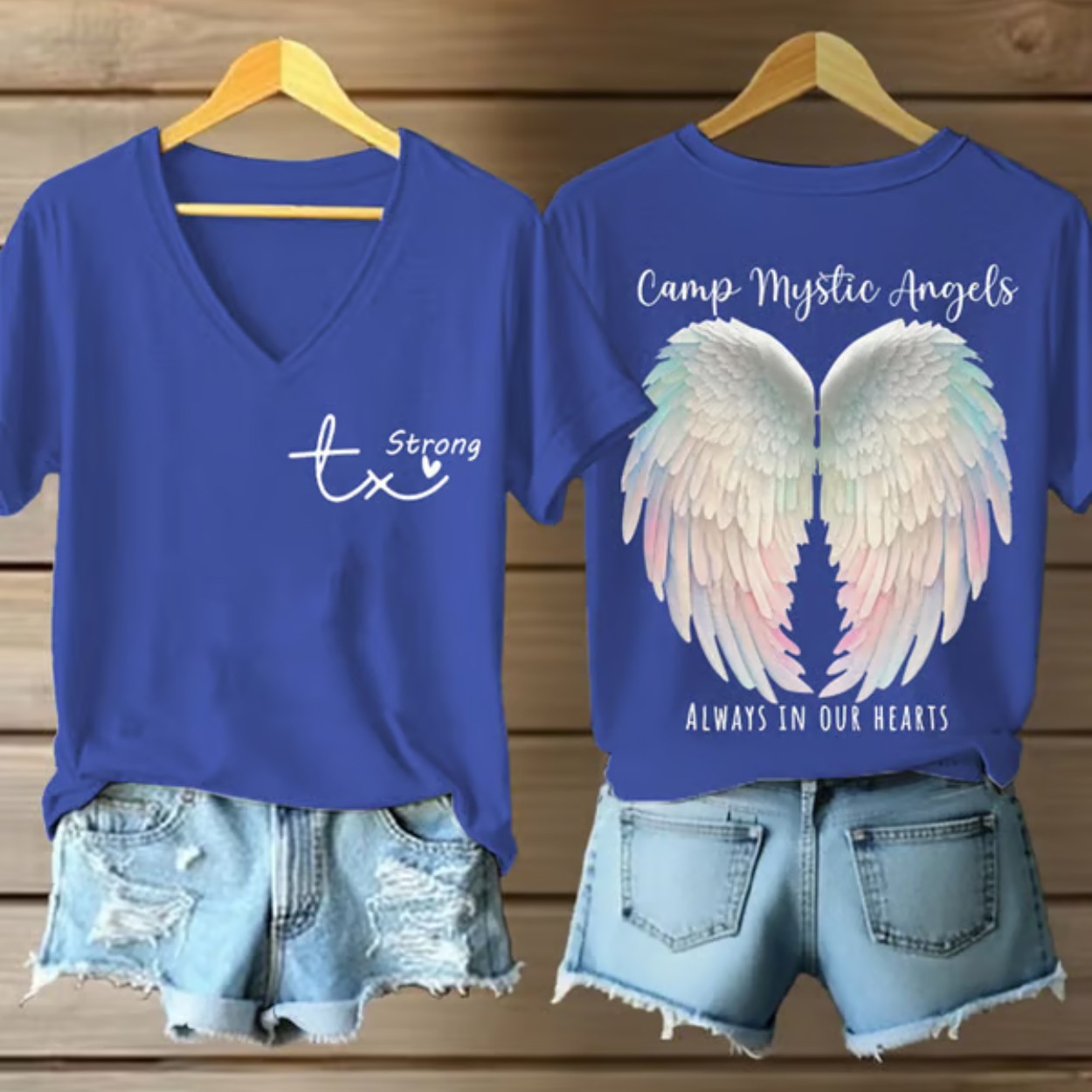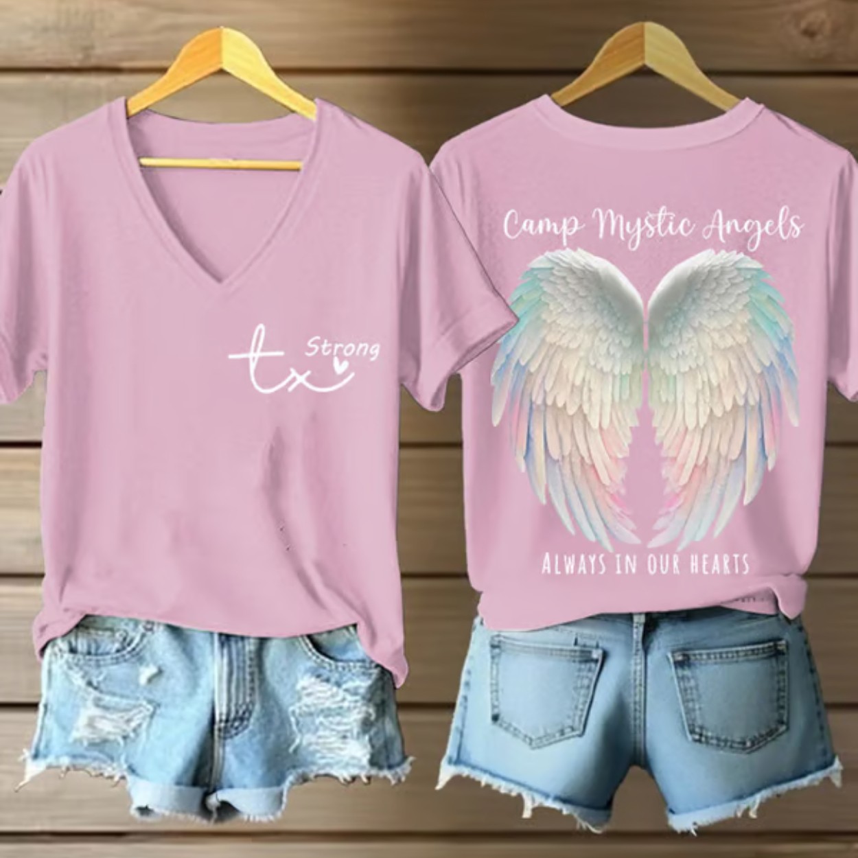 Discover the perfect blend of comfort and meaning with the Texas Strong Camp Mystic Angels Always In Our Hearts Print Casual T-Shirt. Crafted from a durable cotton-polyester blend, this versatile tee is available in sizes S to 6XL, ensuring a perfect fit for everyone. The front features the inspiring “Tx Strong” logo, while the back showcases stunning angel wing artwork paired with “Camp Mystic Angels” and “Always In Our Hearts” text, making it a heartfelt tribute to resilience and love.