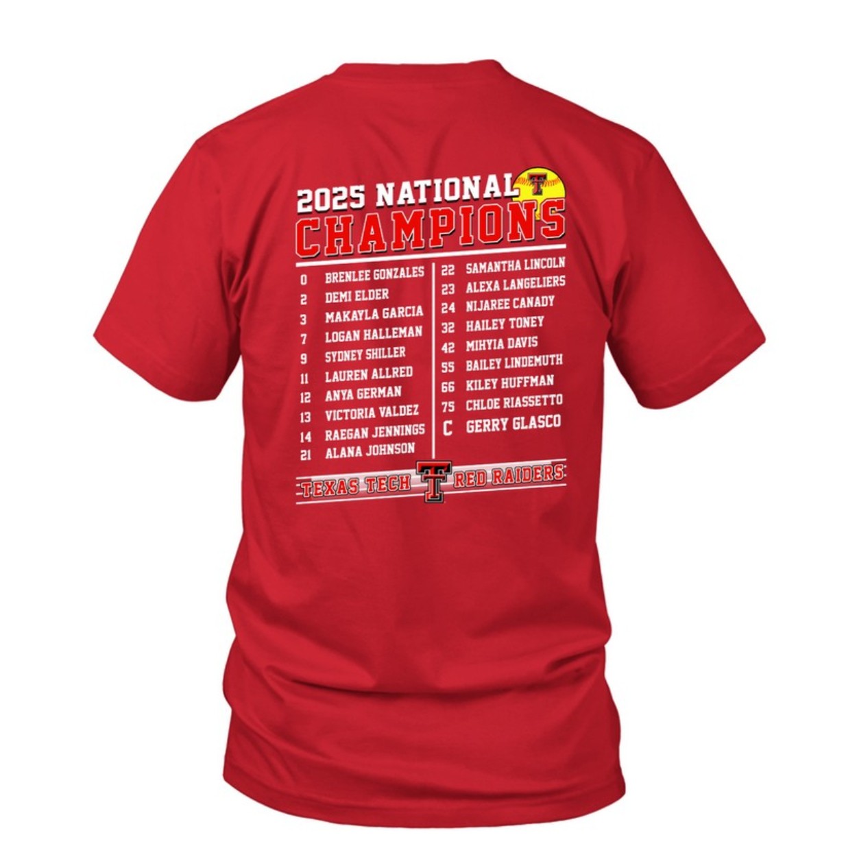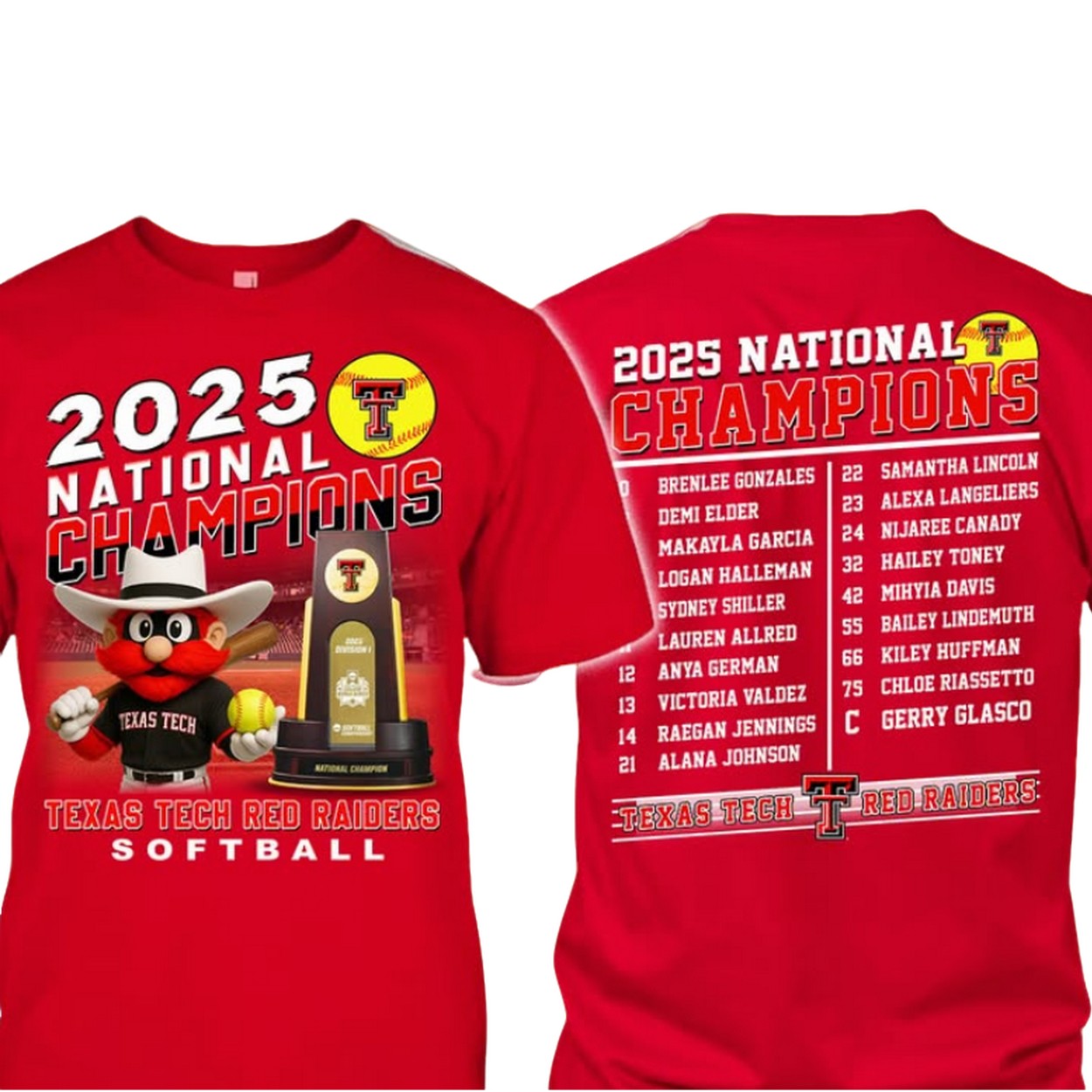 Commemorate an epic triumph with the Texas Tech Softball 2025 National Champions Shirt! This vibrant red tee is a tribute to the Red Raiders’ championship glory, featuring the iconic team mascot holding a softball and trophy against a dynamic stadium backdrop. The front boldly displays “2025 National Champions” with the Texas logo, while the back lists the champion roster and “Texas Tech” in proud lettering. Crafted from a comfortable cotton-polyester blend, this shirt is available in sizes S to 5XL, perfect for fans of all shapes. Its eye-catching design and high-quality print make it a must-have for celebrating this historic win.