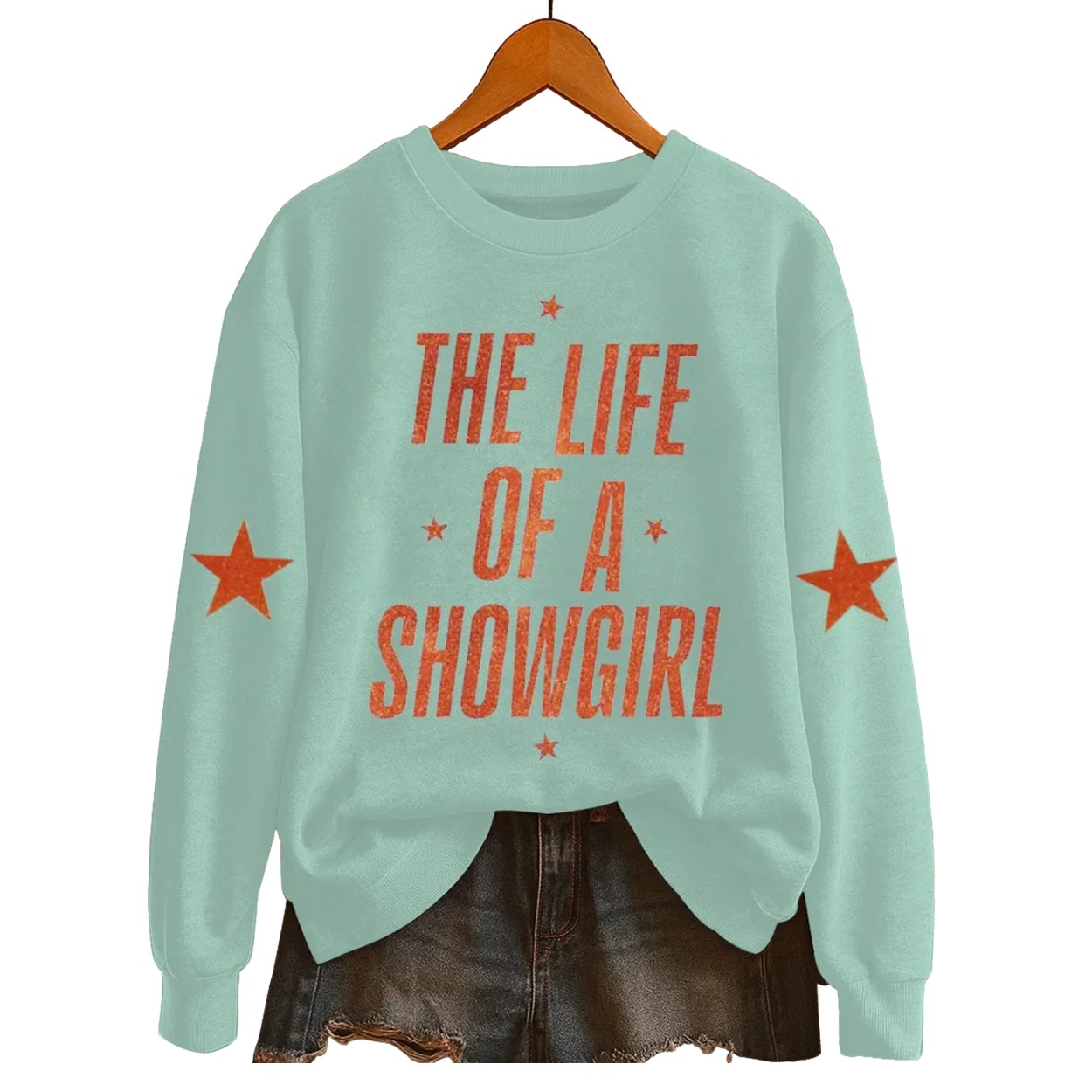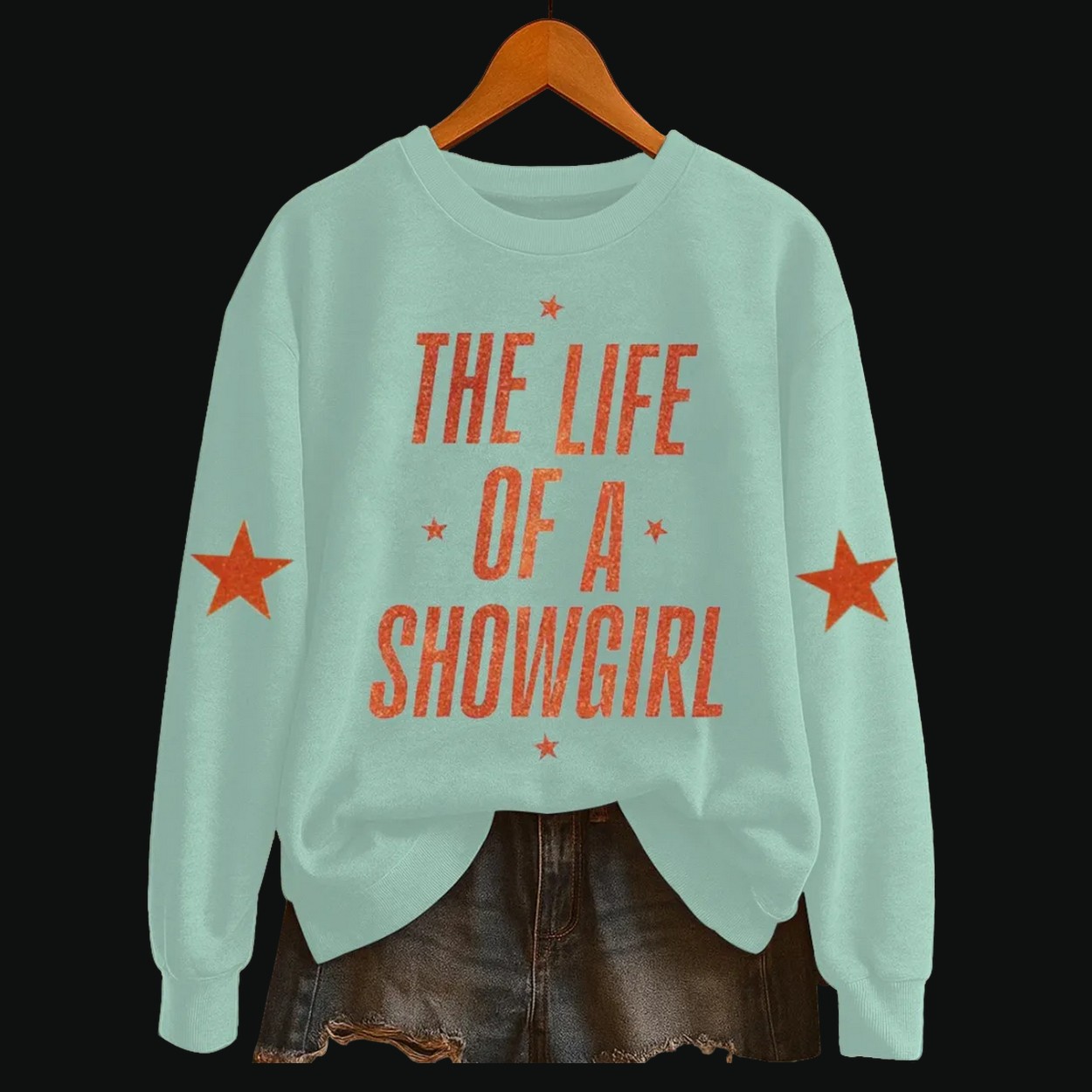 Steal the show with “The Life of a Showgirl” Graphic Sweatshirt. Featuring a bold, vintage-inspired graphic and star accents on the sleeves, this unique piece celebrates glamour and performance art.