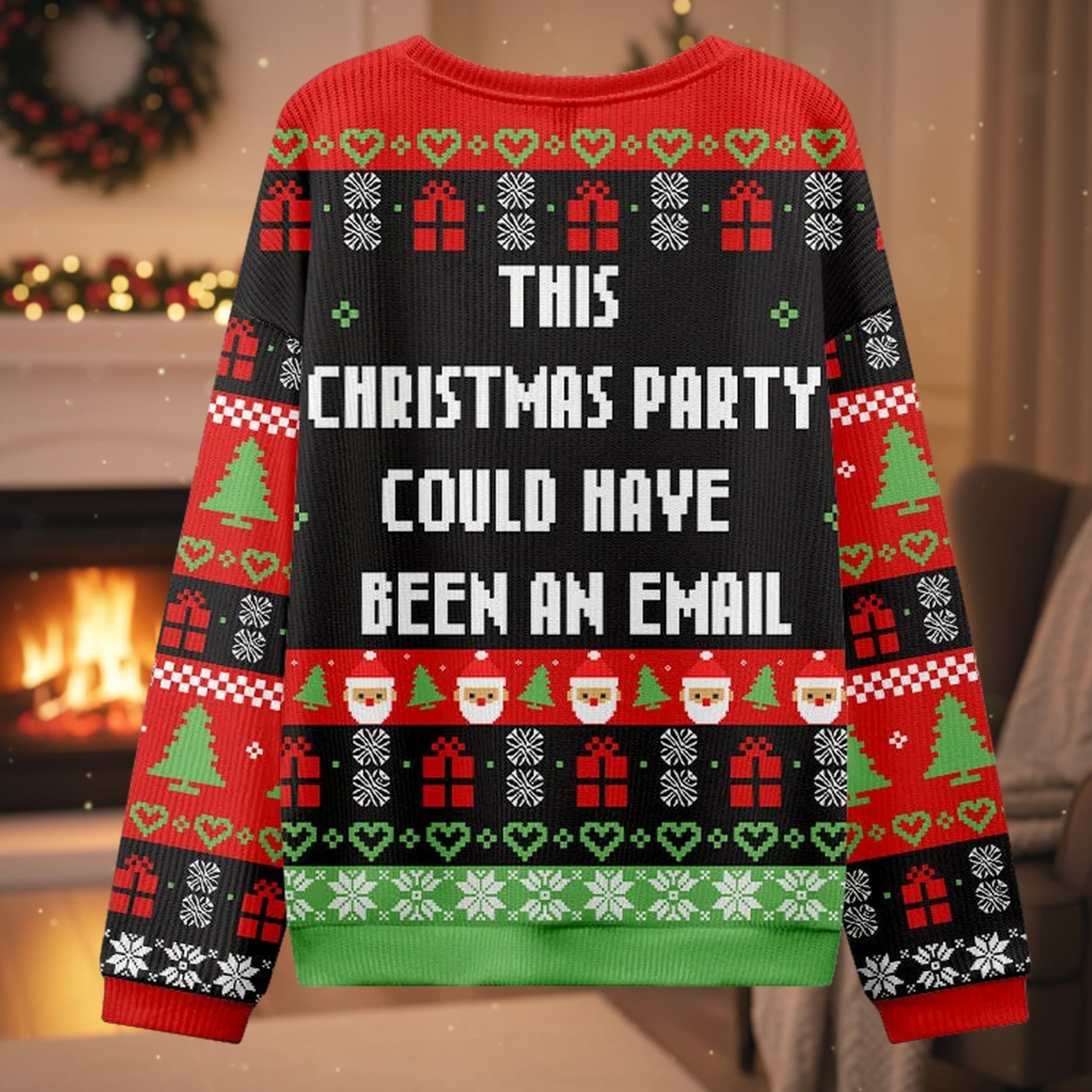 The sweater features a classic, eye-catching Red and Black holiday color scheme. It’s densely patterned with traditional, yet stylized, Christmas motifs: pine trees, Santa faces, snowflakes, hearts, and wrapped presents in green, red, and white. Center stage, in a bold, pixelated white font (nodding to a vintage computer aesthetic), is the universally understood plea: “THIS CHRISTMAS PARTY / COULD HAVE / BEEN AN EMAIL”.