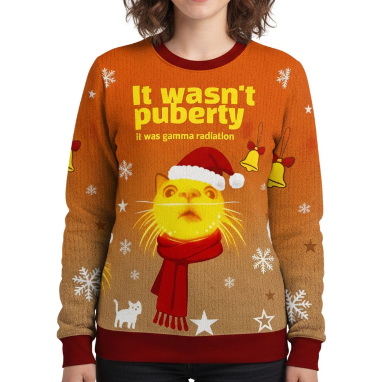Channel your inner holiday monster with the “This Wan’t Puberty It’s Gamma Radiation Christmas Ugly Sweater”!