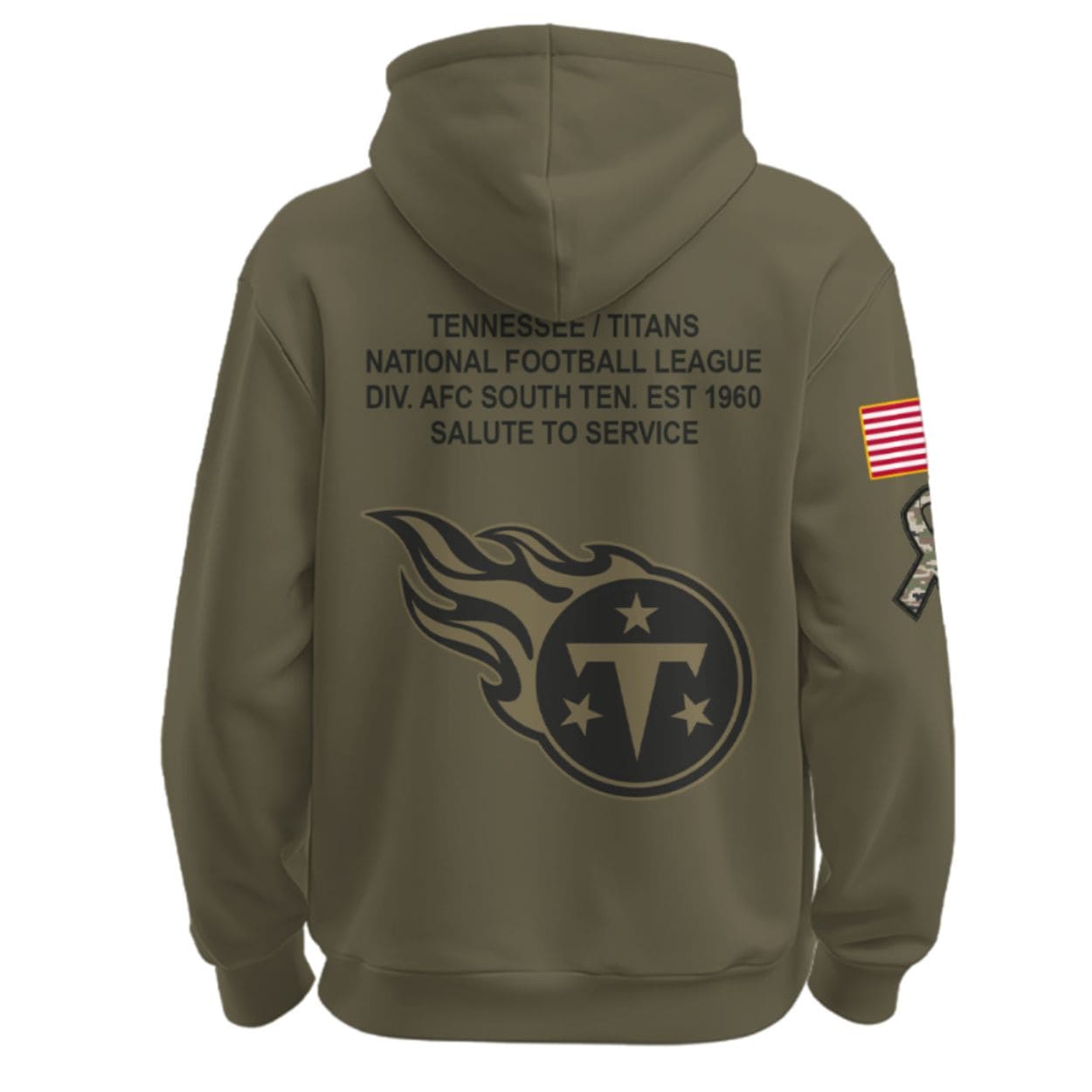 - Back: The reverse side boldly displays text detailing the team’s military connection and founding: “TENNESSEE / TITANS NATIONAL FOOTBALL LEAGUE DIV. AFC SOUTH TEN. EST 1960 SALUTE TO SERVICE”. Below this text, a large, silhouetted Titans logo is featured, cementing team identity.