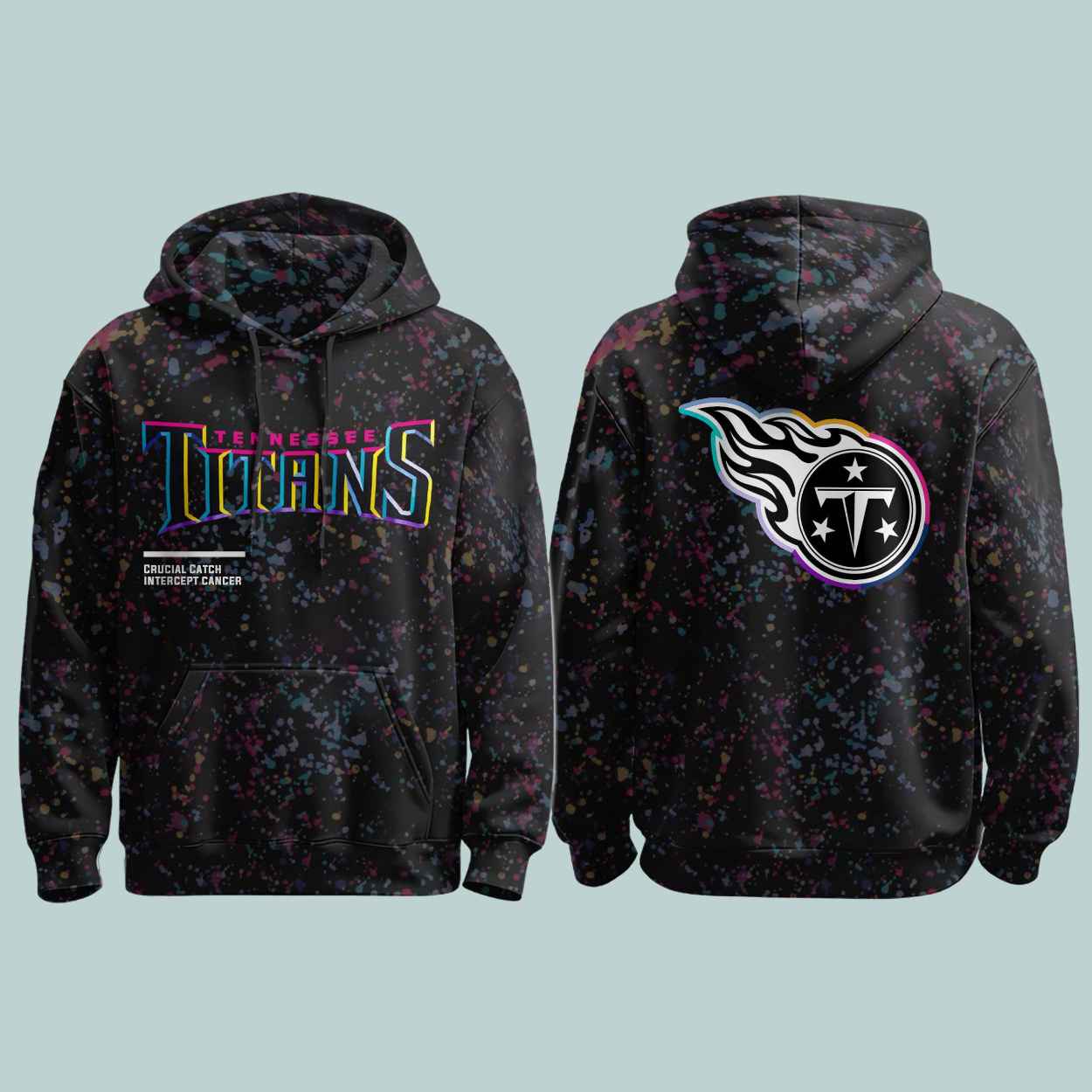 | Design Feature | All-over black/multi-color splatter print, neon-outlined Titans logo, and “CRUCIAL CATCH INTERCEPT CANCER” slogan. |