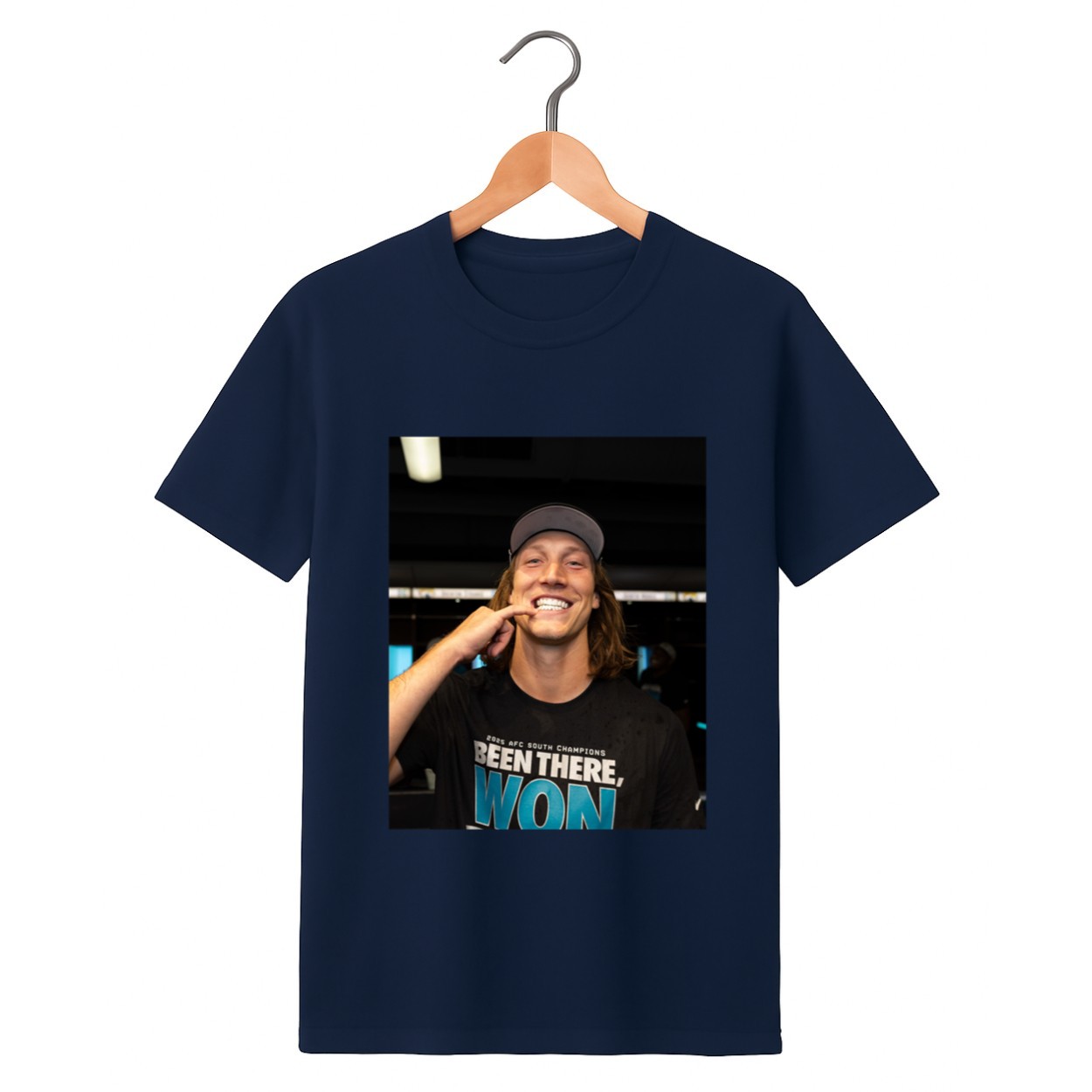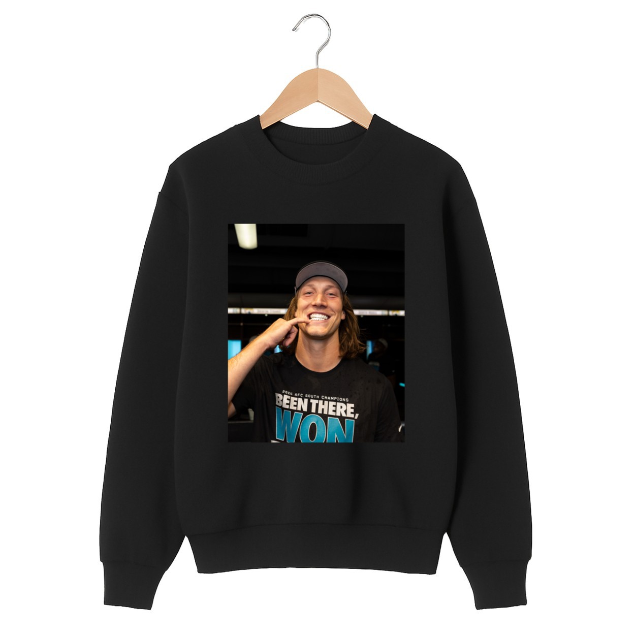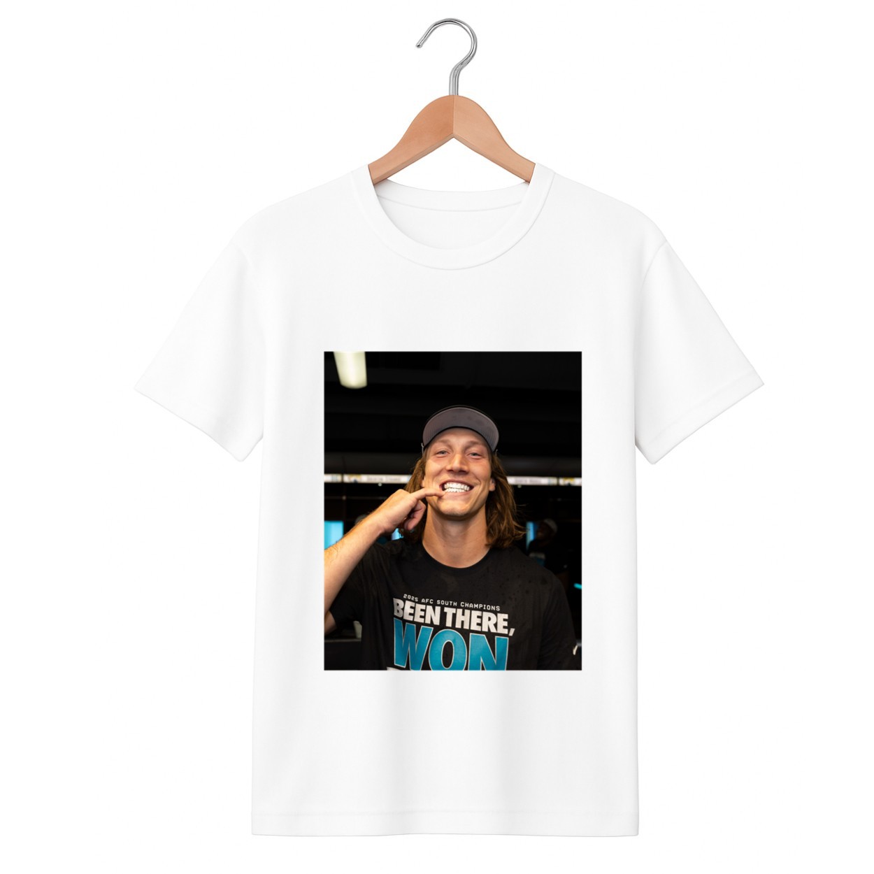 The image shows Trevor wearing the “2025 AFC South Champions: Been There, Won That” gear, adding a layer of authenticity to your fan collection.