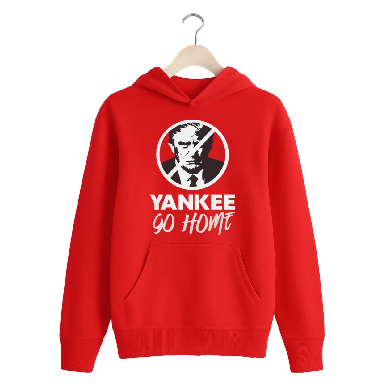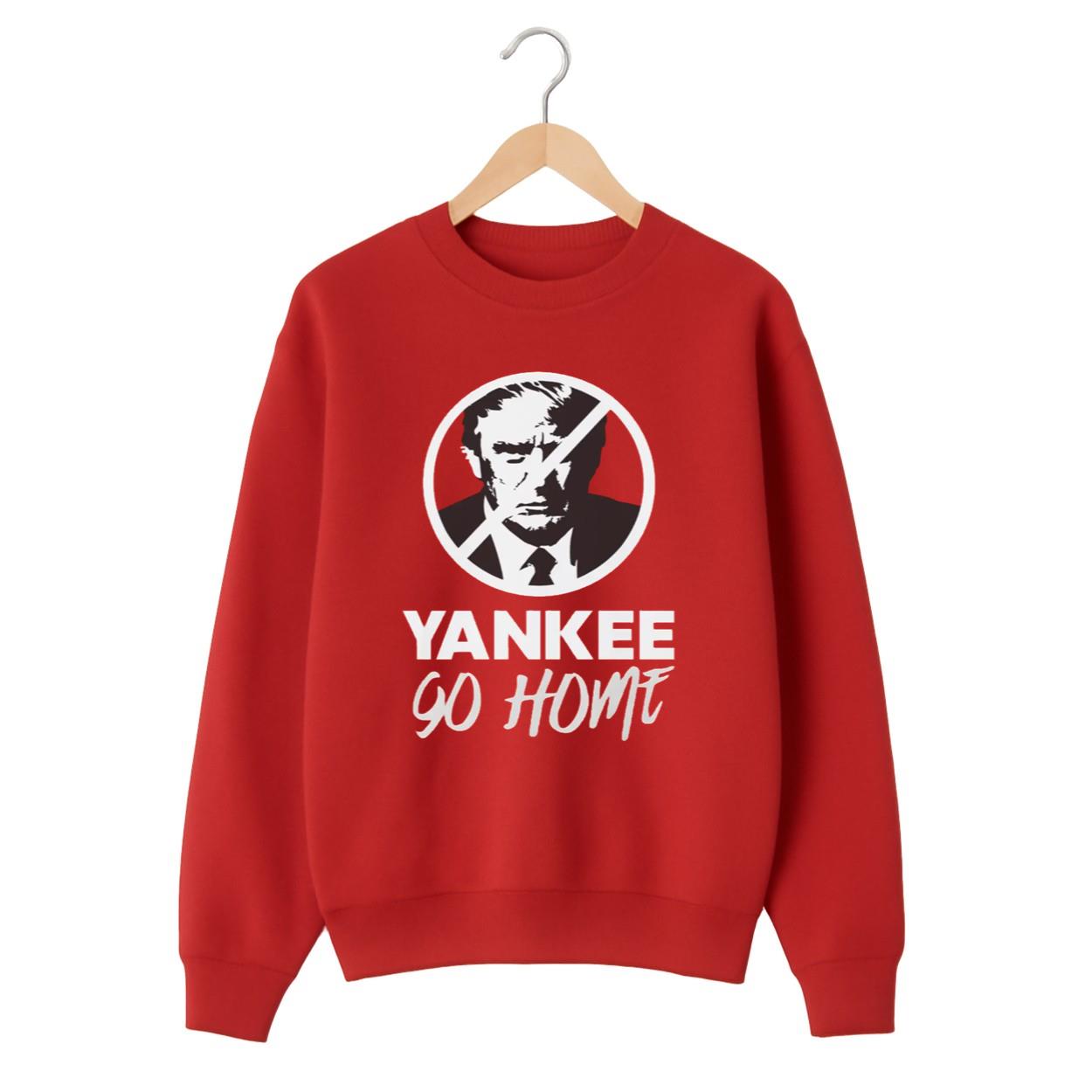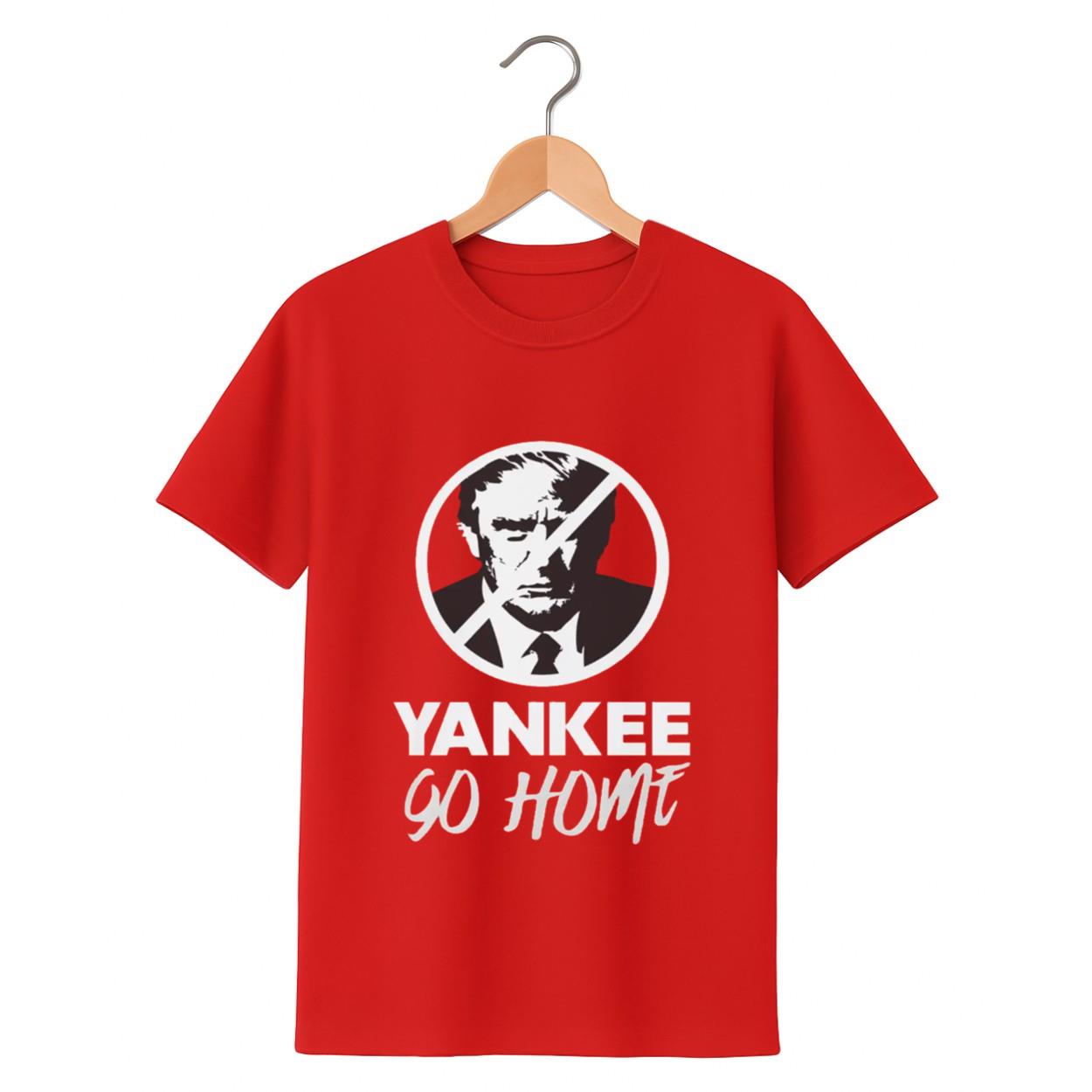 | Design Feature | Single-sided graphic: Prohibition symbol over Trump’s face and the slogan “YANKEE GO HOME” on a Red tee. |