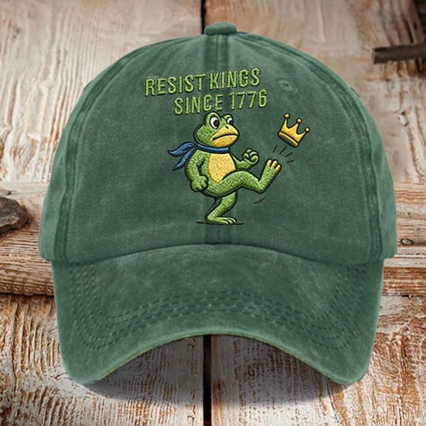 - The Slogan: The text “RESIST KINGS SINCE 1776” is prominently embroidered above the frog in a bold, military-style font, connecting modern resistance to the founding principles of American democracy.