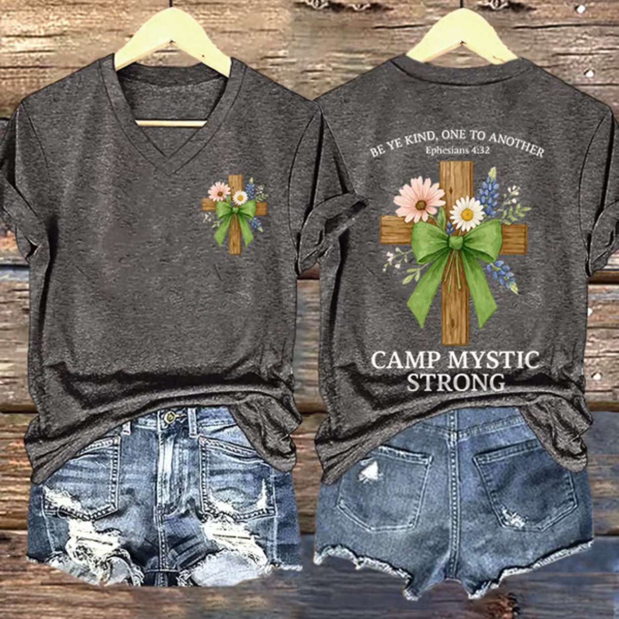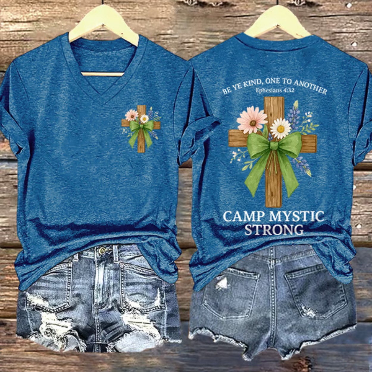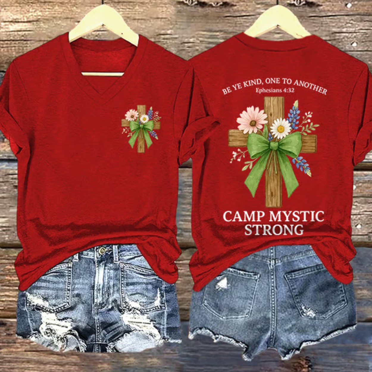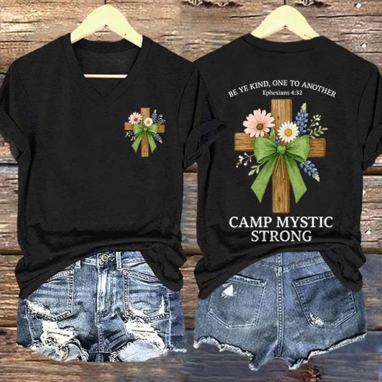 This shirt blends faith, fashion, and support seamlessly. The cotton-polyester mix offers durability, softness, and resistance to fading, making it ideal for daily wear. Its V-neck design adds a touch of sophistication, while the relaxed fit ensures all-day comfort—perfect for community events, casual outings, or gifting to loved ones. Show your support for Camp Mystic with every wear.