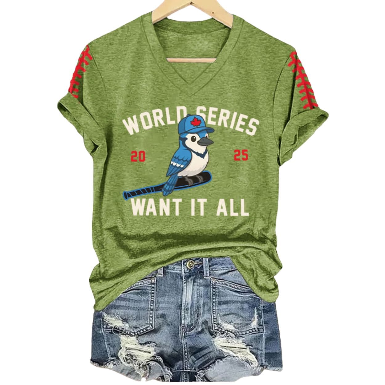 | Design Feature | Single-sided print featuring “World Series 2025” script, a Blue Jay mascot graphic, and baseball stitching details on the V-neck tee. |
