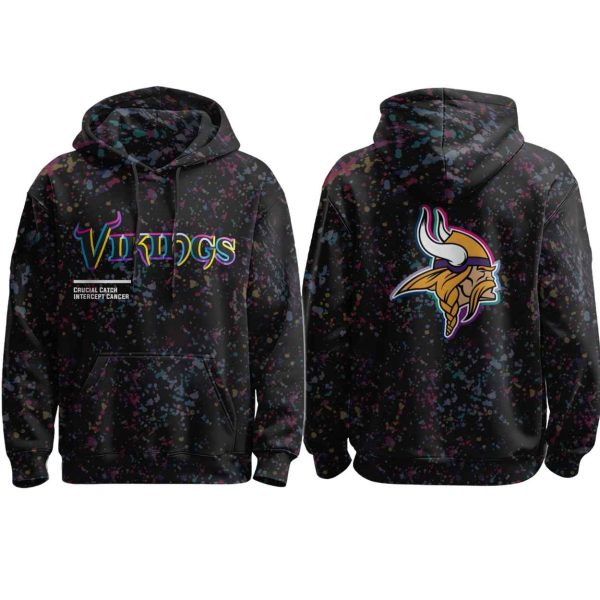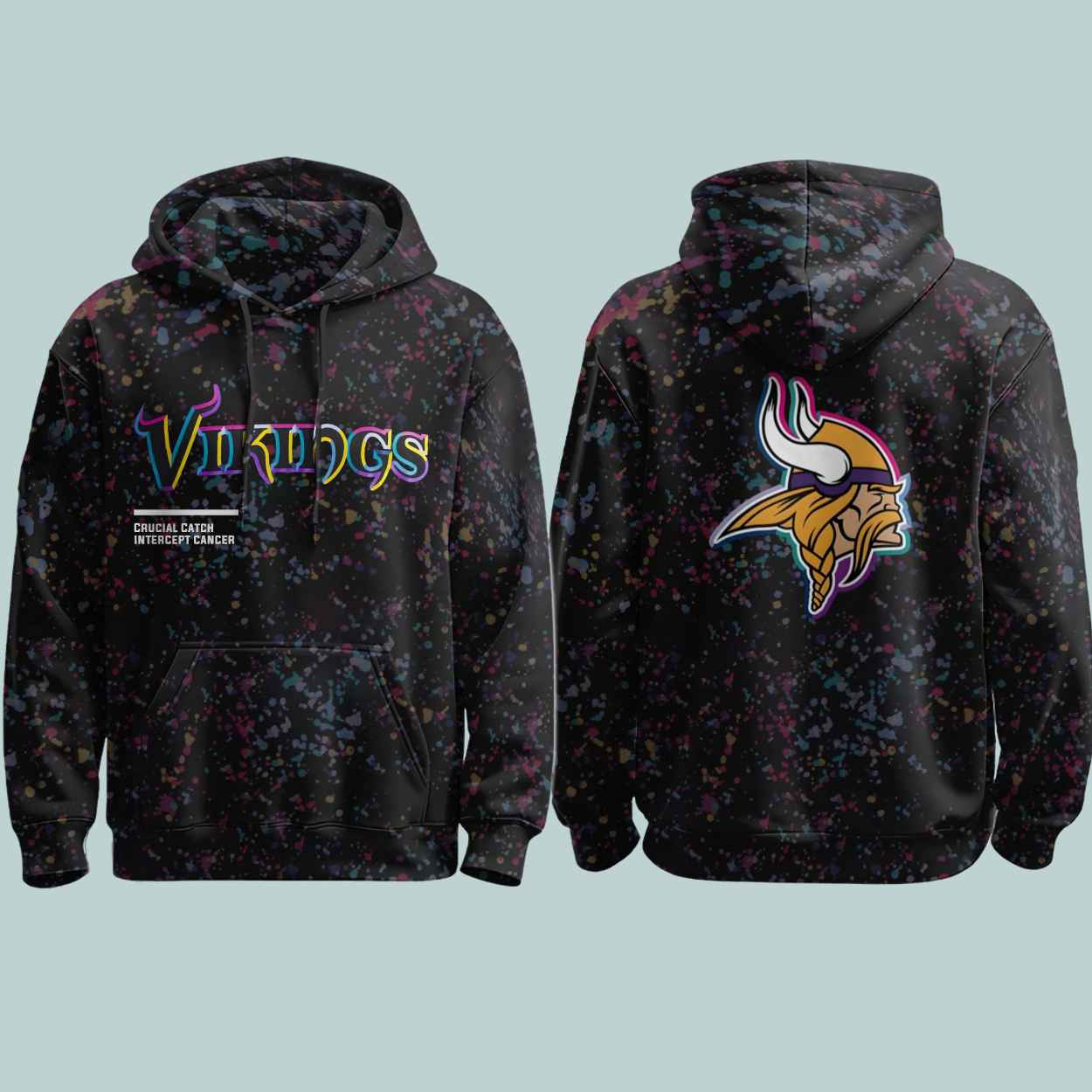 | Design Feature | All-over black/multi-color splatter print, neon-outlined Vikings logo, and “CRUCIAL CATCH INTERCEPT CANCER” slogan. |