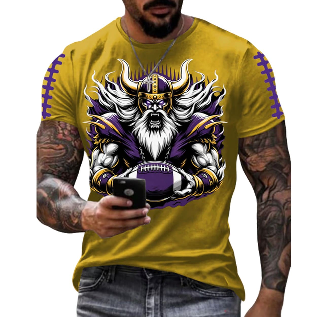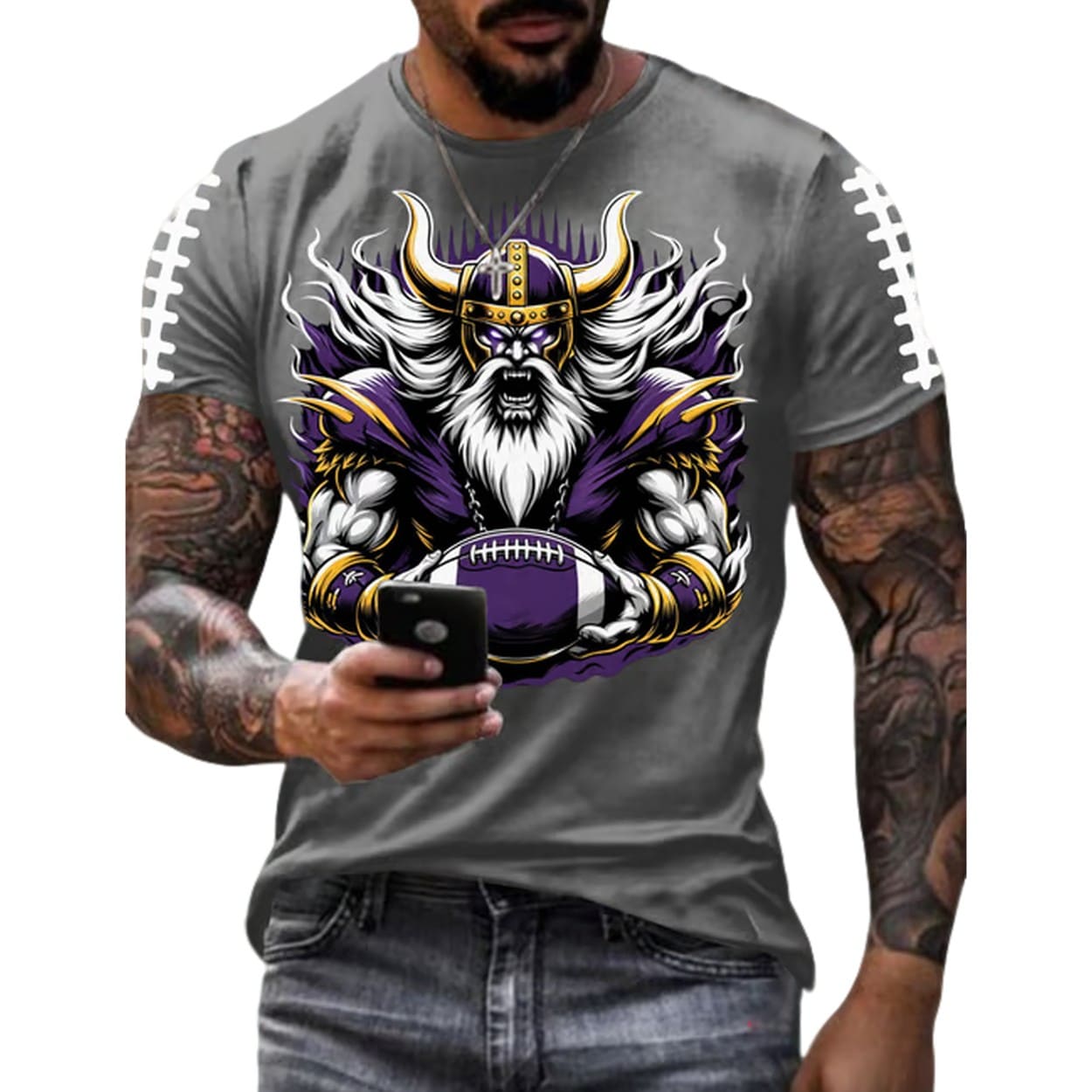 | Design Feature | All-over print featuring a detailed, aggressive Viking warrior holding a football, plus white football stitching details on the shoulders. |