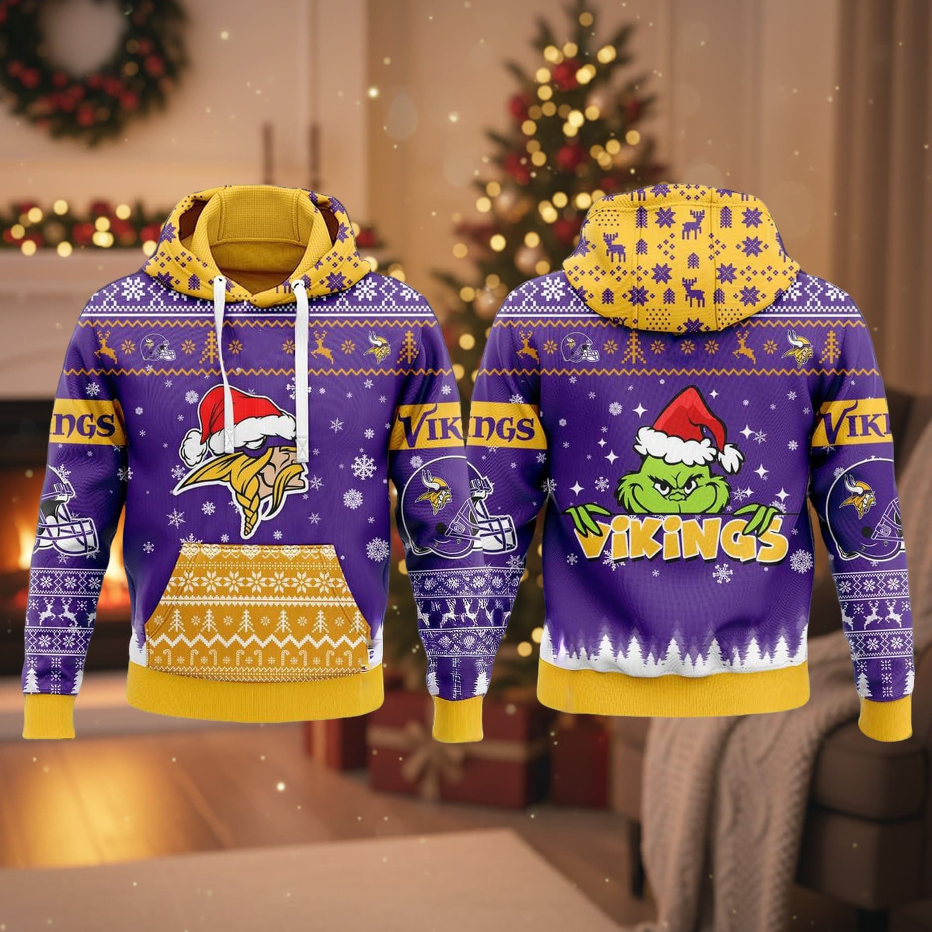 The Back features the sweater’s mischievous highlight: a hilarious Gr*nch-like green character wearing a Santa hat, standing over the bold “VIKINGS” wordmark. This cheeky design perfectly captures the spirit of a team ready to steal a few wins. The hood features a reverse yellow-and-purple pattern with reindeer and snowflakes.