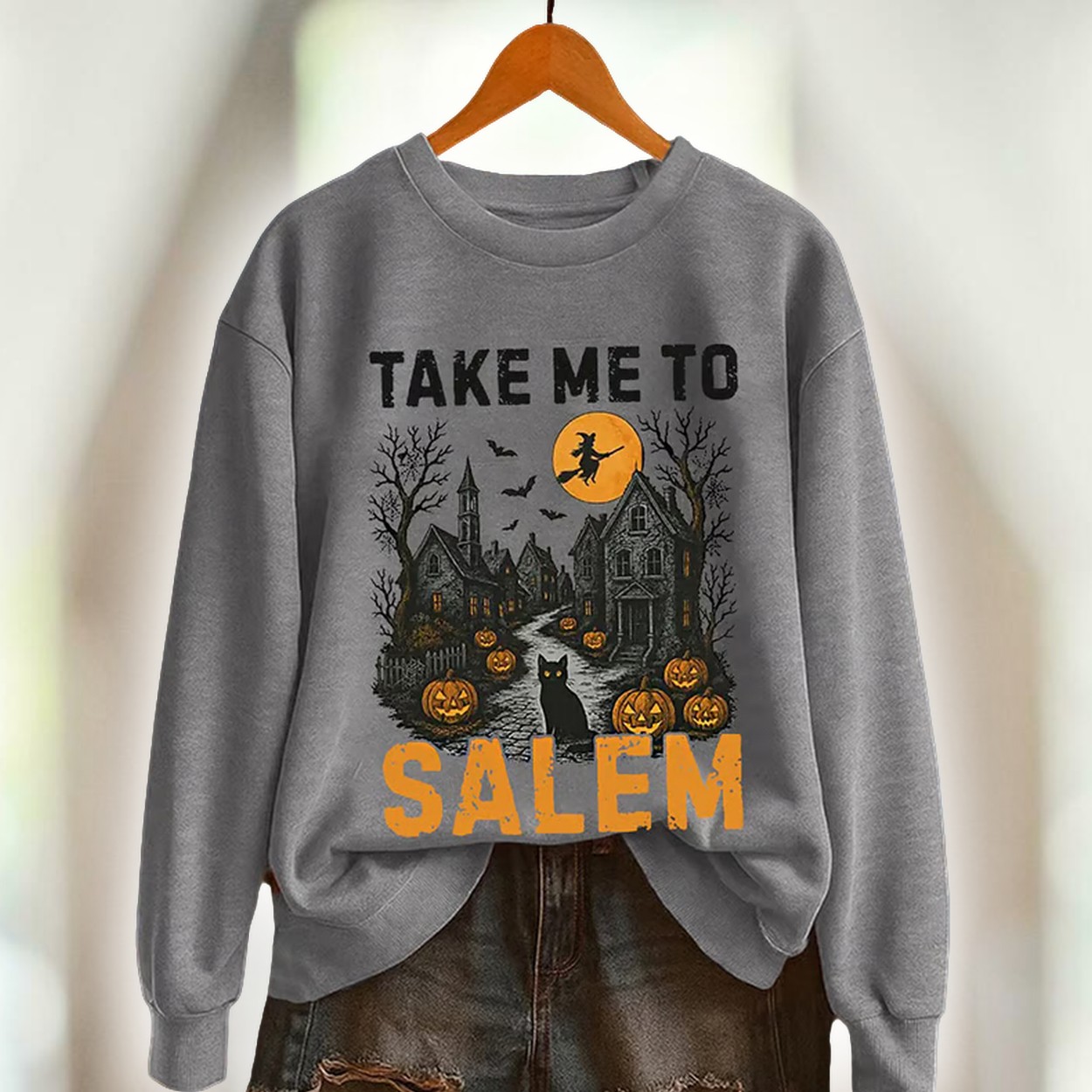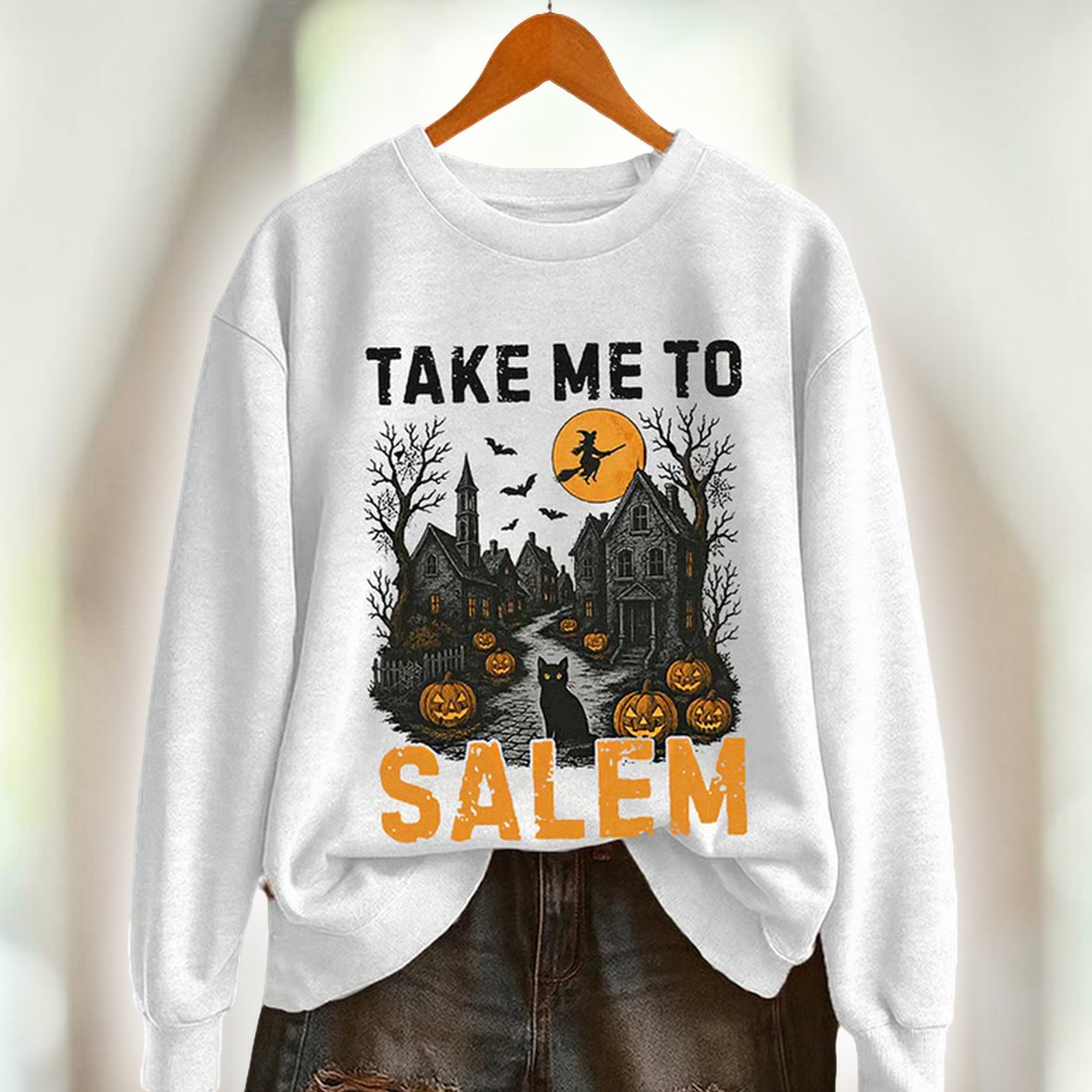 Embrace the eerie allure of Halloween with the Vintage Halloween Take Me To Salem Print Sweatshirt, a perfect addition to your seasonal wardrobe!